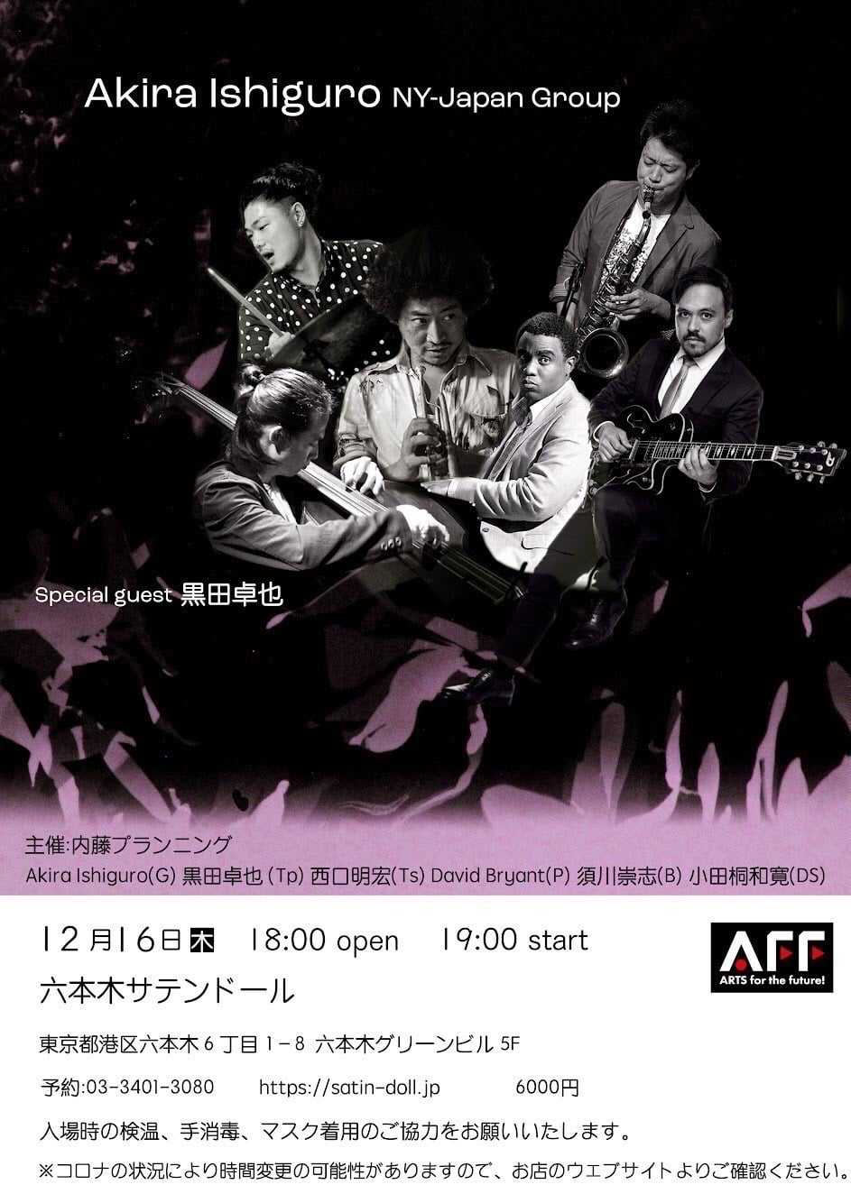 本日はAkira Ishiguroさんのセッションを聴きに六本木サテンドールに参上!素晴らしいセッション。今年、行ったライブの中で間違いなく5本指に入ると感じた。明日12/17も同じメンバーで関内ホールでGigがあったが、終了したので2021年12月18日午前1時にセットリストを追記。AkiraさんのGigは<< 2021 Jun 23rd 石黒晃 from NY リーダークァルテット@南青山Body&Soul >>以来、2回目。その時も物凄いライブだったが、今日はさらに気心が知れたメンバーだったためか躍動感に満ち溢れていた。Davidさんは2曲、「2.Enchant」、「9.1212」で見事なピアニカの演奏を披露。ピアノもいつにも増して楽しそうに弾かれていた。■ Akira Ishiguro NY-Japan Group featuring 黒田卓也日付 2021年12月17日(金)時間 18:30 Open/19:00 Start会場 横浜関内ホール(小ホール)URL: https://jazzpro.jp/for_the_future?fbclid=IwAR2YhUyXAHPyBw3Gc5Loe-EGIvskbGEYMu7pJZDHFAEGC2KEglulRbo7xx0<<2021 Dec 16th Akira Ishiguro NY-Japan Group Special guest 黒田卓也@六本木Satin Doll>>Akira Ishiguro(G)from NY、黒田卓也 (Tp)from NY、西口明宏(Ts)、David Bryant(P)、須川 崇志(B)、小田桐和寛(Ds)1st 1.Align - 真っ直ぐにする 2.Enchant - Davidさんピアニカも披露 3.Dear Spring With Love 4.Geronimo 2nd 5.Fuss - Human Feel 6.Beatrice - Sam Rivers 7. Lonely Note- 寂しい音の響き。Heart Breakを曲にした。ご自分の体験ではない、らしい。笑8. 武蔵丸 Enc 9.1212 - 新曲。Davidさんピアニカも披露