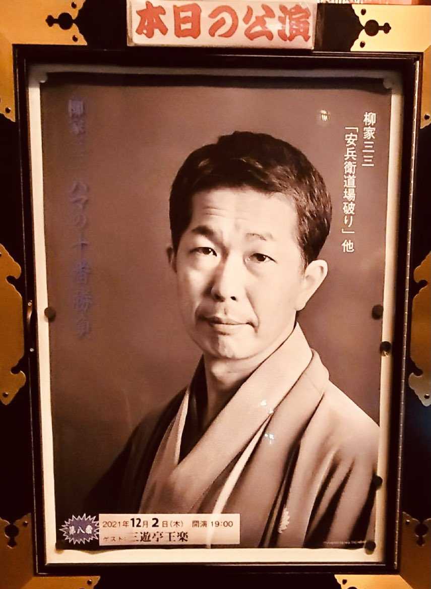 本日は柳家三三さんの落語を聴きに横浜にぎわい座に参上!今週は二日に1回は三三さんの落語を聴きに来ている。中々の追っかけ振りだ😊🤞明後日12/4も神保町まで兼好さんと三三さんの二人会に参上予定。三三さんの「橋場の雪」はずっと聴きたかった演目で、ようやく聴けた。冬の到来に感謝。同じように奥さんに夢から起こされる、「天狗裁き」のクダリ、「吊るされた八五郎が途方に暮れていると、突風が吹いて八五郎の体が宙に浮く」もチラリと触れた。これは三三さんの「天狗裁き」も聴きたいと思った次第。確か、今年の2月頃、桂春若さんがNHKの「日本の話芸」で「天狗裁き」を演じていたはず。王楽さんの落語は初見参。お父さんの好楽さんより上手いのではないか?と思わせる芸。三三さんをして「色気に参ってしまう」久次の男っぷりが良い。三三さんから教わった演目で王楽さん、「タップリとお足を稼がせていただいた」そうで、逆に王楽さんから三三さんが教わった演目で「タップリとお足を稼がせていただいた」とのこと。いわゆるWINーWINな関係。三三さんが王楽さんからネタを学ぶということから如何に王楽さんの腕の確かさが分かる。「安兵衛道場破り」も初めて聴くネタ。大昔、父親が喜んで観ていた主演:高橋英樹さんの時代劇『ぶらり信兵衛 -道場破り-』の元ネタは、この「安兵衛道場破り」なんだろうと思った。高橋さんがワザと負けるシーンは、今日の三三さんの演じた安兵衛、そのものだった。<< 2021年12月2日「柳家三三 ハマの十番勝負」@横浜にぎわい座>>一.開口一番「手紙無筆」三遊亭二之吉一.「橋場の雪」柳家三三一.「包丁」三遊亭王楽<仲入り>一.「安兵衛道場破り」三三
