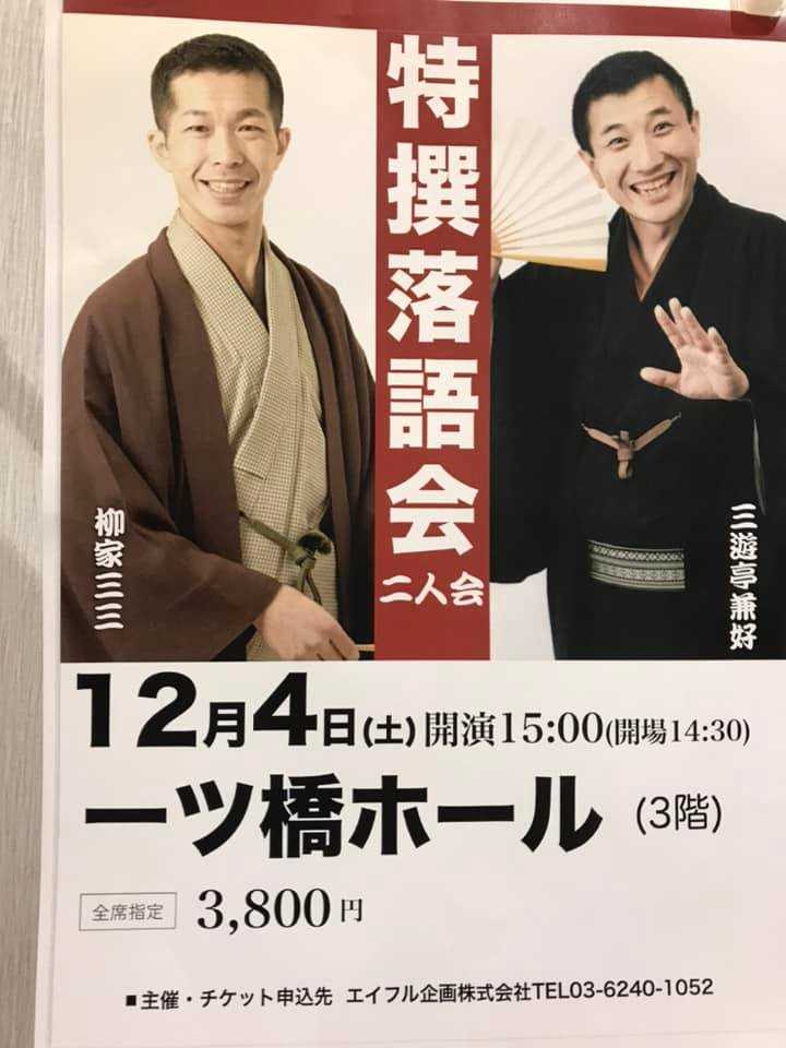 本日は柳家三三さんと三遊亭兼好さんの噺を聴きに一ツ橋ホール@神保町に参上!「湯屋番」は冒頭部分を三三さん流にアレンジ。柳亭小痴楽さんなどが演じているのを聴いたが、冒頭部分で「居候にイヤらしく、御櫃から御飯をヨソッテ渡す」描写を変えて演じた。兼好さんが古典をアレンジするところを意識した趣向か。1席目からお二人の丁々発止な火花を感じた。「三方一両損」は久々聴いた感じだが、兼好さんの江戸っ子堅気な、粋と勢いが実に小気味良い。3両を拾った神田白壁町に住む左官の金太郎と返してもらった3両を受け取らない神田竪大工町の大工の吉五郎。意地と意地のぶつかり合い。「館林」は初めて聴く噺。兼好さの噺は高座も配信も随分聴くが、同じ演題が一つもない。持ちネタの多さに驚嘆。斬り取られた半公の首が喋るシュールな展開。先代の桂文治さんがよくやったが、今やる演者も少ないのは勿体ない。三三さんの「富久」。<< 2021年11月16日「柳家三三 独演会『秋』」@有楽町よみうりホール>>でも聴いたネタだが、今日も勿論イケている。酒でしくじった旦那の家で泥酔して家人に絡む久蔵。久蔵が鳶頭に半狂乱でつかみかかるクダリ。思わず、笑ってしまう。17時過ぎに終わったので、暫し神保町巡りに散策。来年3月末を目途に建て替える三省堂。4Fの奥に落語コーナーがあるので、1時間ほど落語三昧。昔よく行ったロシア料理の店も未だあって、一安心。今日は神保町の名店の喫茶「さぼうる」まで辿り着けなかったが、次回は「さぼうる」でノンビリ過ごしたい。<< 2021年12月4日「特撰落語会・柳家三三、三遊亭兼好二人会」@一ツ橋ホール(神保町)>>一.開口一番「子ほめ」三遊亭ごはんつぶ一.「湯屋番」柳家三三一.「三方一両損」三遊亭兼好<仲入り>一.「館林」兼好一.「富久」三三参考)本社ビル建替えに関するご案内 by 株式会社三省堂書店