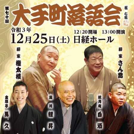 今日は落語を聴きに日経ホールに参上。2021年12月25日(土) 第70回大手町落語会@日経ホール一. 開口一番「まんじゅうこわい」桃月庵あられ一.「厄払い」金原亭馬久一.「お茶🍵汲み」桃月庵白酒一.「くしゃみ講釈」柳家権太楼<仲入り>一.「武助馬🐴」瀧川鯉昇一.「文七元結」柳家さん喬