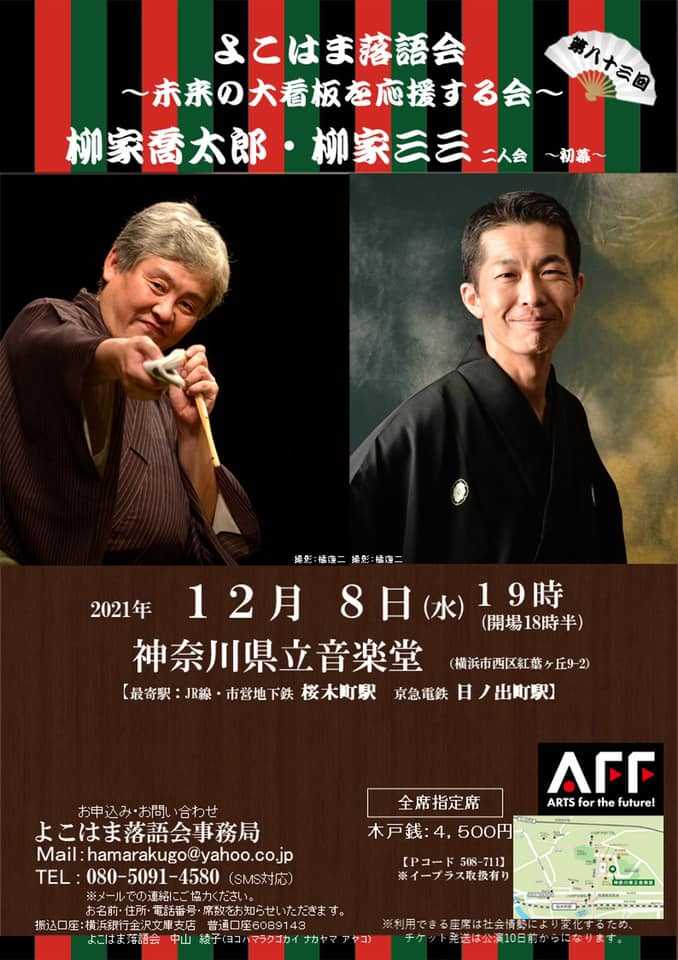 今日は喬太郎さんと三三さんの落語を聴きに県立音楽堂に参上!雨の紅葉坂🍁の登りはキツい🐸🐴今日は三三さんの「二番煎じ」が聴けて良かった。11/25は喬太郎さんと白酒さんの二人会@武蔵中原に参上したので、「柳家小三治 柳家三三 親子会 改め 小三治を偲ぶ会」で三三さん演じた「二番煎じ」が聴けず残念だったが、「待てば海路の日和あり」。喬太郎さんの「小言幸兵衛」も抱腹絶倒の出来。<< 2021年11月18日「桃月庵白酒x三遊亭兼好 ふたり会」@日本橋公会堂(水天宮)>>で兼好さんの「小言幸兵衛」も良かったが、今日の喬太郎さんの「小言幸兵衛」はさらに素晴らしかった。<<2021年12月8日(水) 柳家喬太郎・柳家三三 二人会〜よこはま落語会〜@神奈川県立音楽堂>>一.開口一番「加賀の千代」柳亭一寿一.「幇間腹(たいこ腹)」柳家喬太郎一.「二番煎じ」柳家三三<仲入り>一.「短命」三三一.「小言幸兵衛」喬太郎