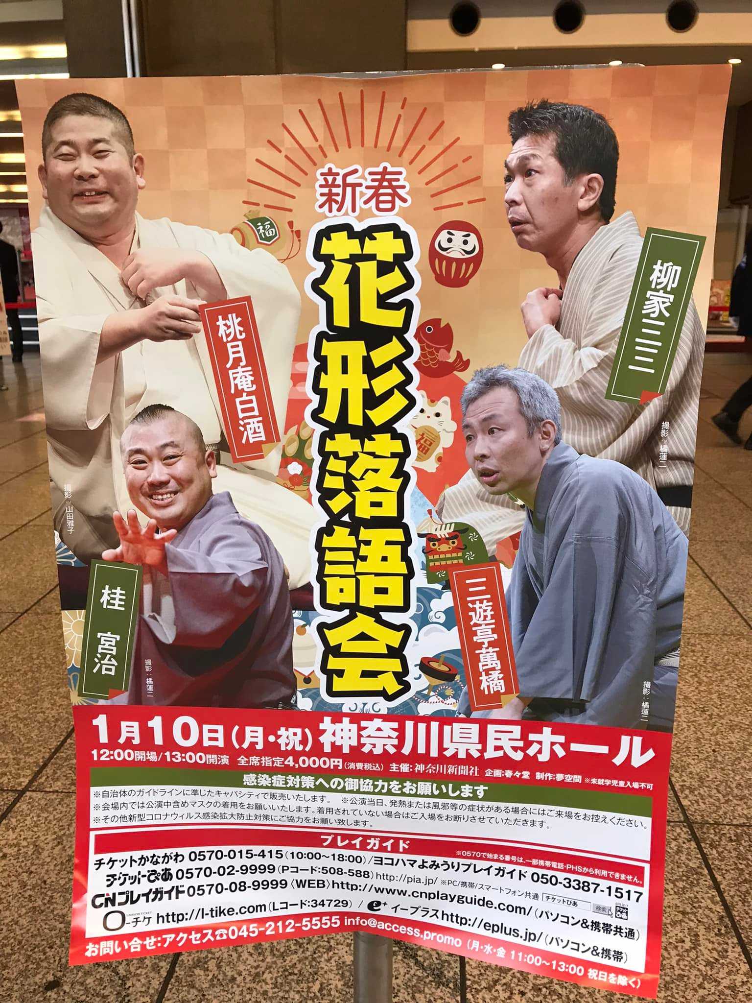 本日は三三さん/白酒さん/萬橘さん/宮治さんの落語を聴きに神奈川県民ホールに参上!1/5(水)の西新井でも三三さん、萬橘さん、宮治さんの3人会を聴いたので、人気者の3人集結を週に2回も味わえるとは中々レアな体験。西新井で三三さんと萬橘さんが大の仲良しなのが分かったが、「妾馬🐴」のお殿様の御前に向かう途中で萬橘さんが外したままの眼鏡👓の置き忘れに気付く三三さん。噺に眼鏡を差し込んでから萬橘さんを三三さん。お二人の仲の良さを感じ入って幸せな心持ち。2022年1月10日(月)新春花形落語会@神奈川県民ホール一. 開口一番「つる」桃月庵あられ一.「初天神」桂宮治一.「転宅」桃月庵白酒<仲入り>一.「時そば」三遊亭萬橘一.「妾馬🐴」柳家三三