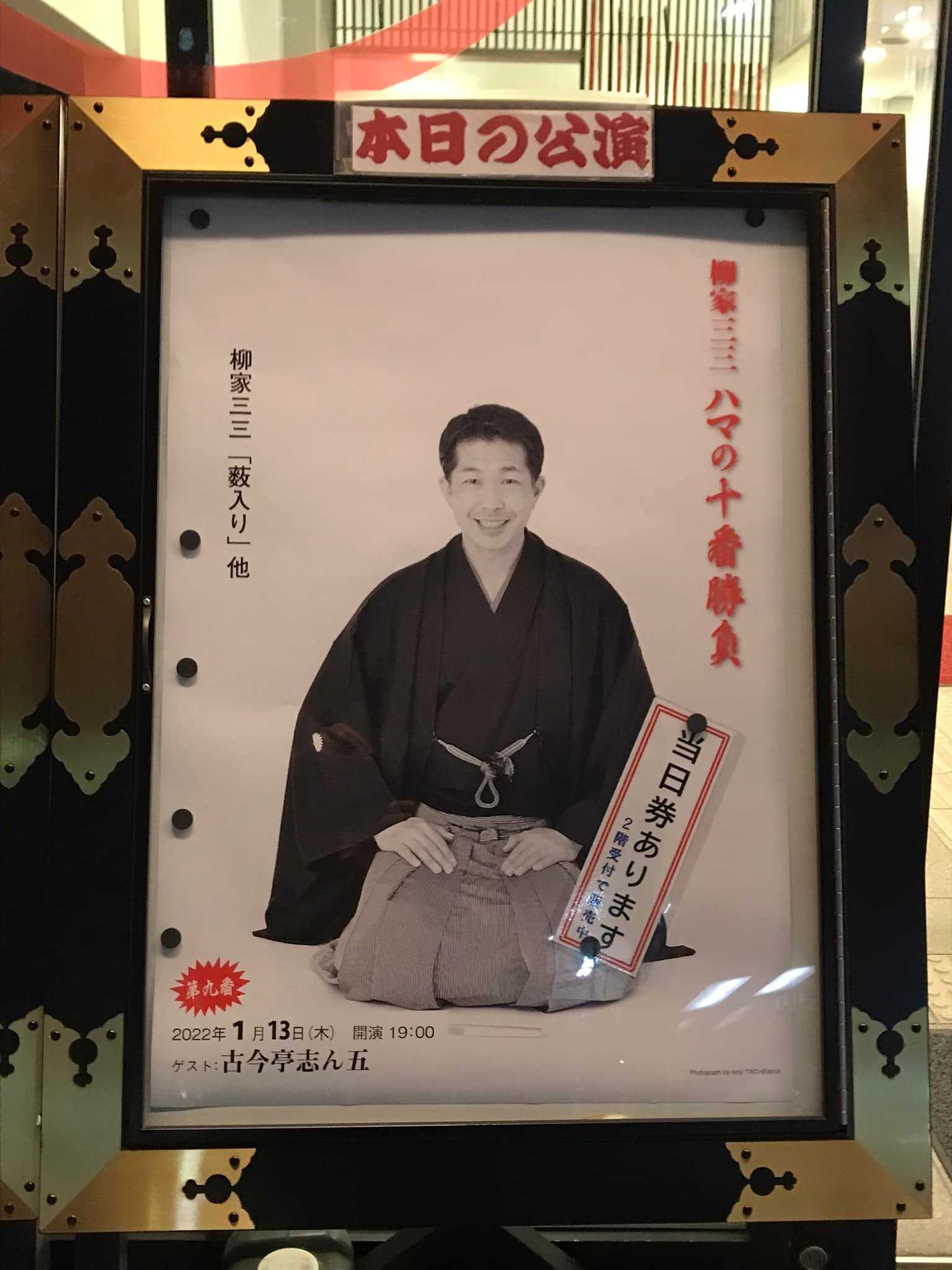 本日は柳家三三さんの落語を聴きに横浜にぎわい座に参上!急に思いついた「ウラジオストック」や「ばい菌」をマクラに織り込んで、受けない「オヤジギャク」がタップリの三三流。今年初めての「柳家三三 ハマの十番勝負」も舌好調。先代の志ん五さんにみっちりと「お稽古」を付けてもらったという三三さん。当代の志ん五さんは初めてお聴きしたかと思うが、古今亭の「色気」や品が良い「明烏」ナカナカ良かった。三三さんの「締め込み」は久しぶりにお聴きしたネタ。泥棒ネタはお正月に相応しい、縁起の良い「泥棒ネタ」。「ハマの十番勝負」の三三さんの1席目は短めが多いが、先月の「橋場の雪」に続いて、長く演じていただいた。<< 2022年1月13日「柳家三三 ハマの十番勝負」@横浜にぎわい座>>一. 開口一番「まんじゅうこわい」古今亭松ぼっくり一.「締め込み」柳家三三一.「明烏」古今亭志ん五<仲入り>一.「薮入り」三三今日は春風亭三朝さんが小田原の風情ある蕎麦屋・寿庵さんに呼んでくれました。林家あずみさんも一緒で賑やか!