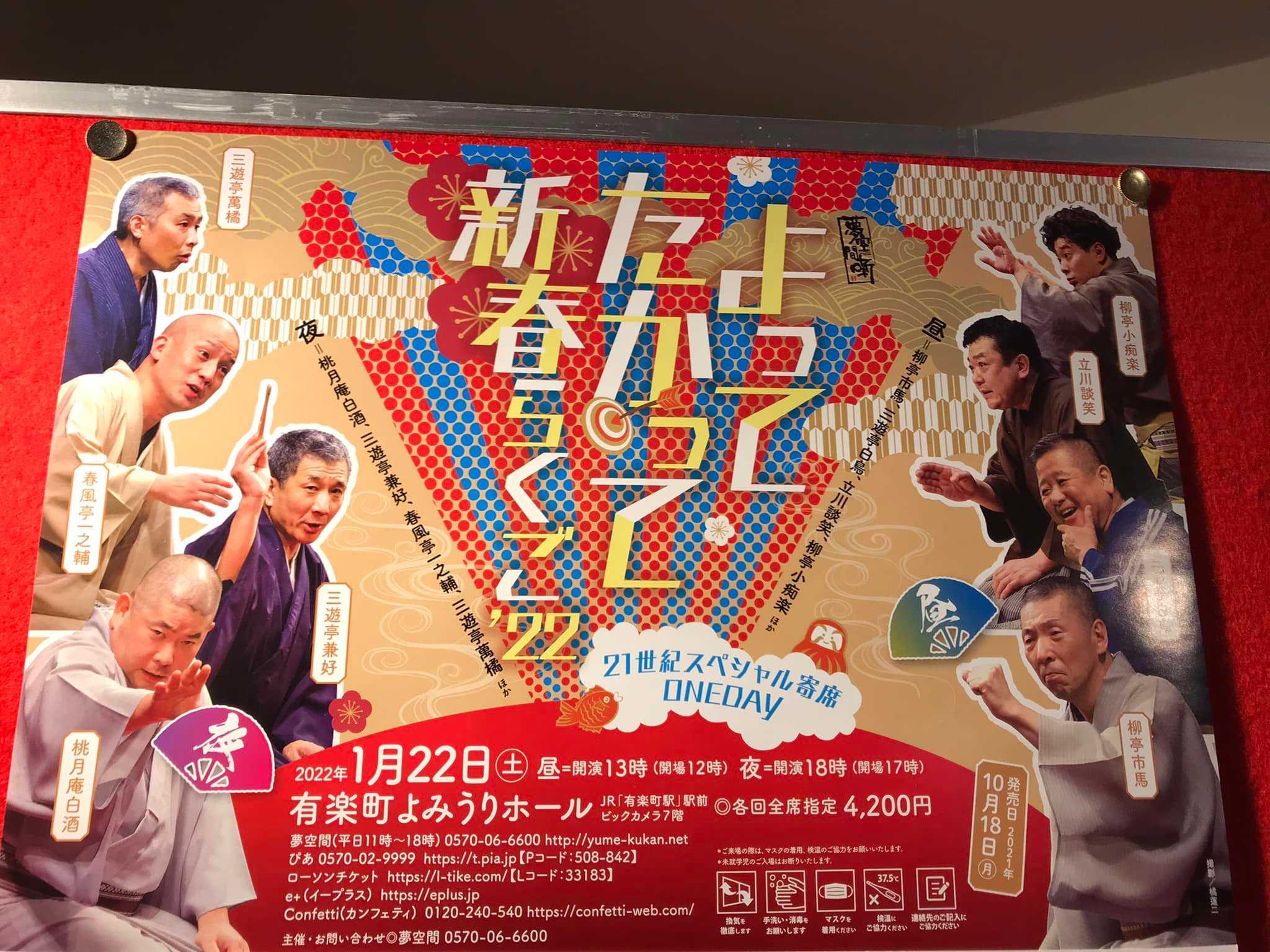 今日も落語を聴きに有楽町よみうりホールに参上!抽選で予約して「2F」の席だったのでイマイチかと勝手に思っていたが、舞台から1Fの4列目の席と同じ距離で、視線の高さが舞台の師匠の方々とほぼ同じで良席。今週の「真一文字の会 2022/1/19(水) 18:30 開演@国立演芸場 (東京都)」に引き続き、4席目の一之輔さんの「七段目」。配信で聴いた、「千早ふる」と「藪入り」入れると実に6席目。一之輔さんの歌舞伎好きが遺憾なく発揮。鳴り物入りの「七段目」は実に臨場感溢れる。家に帰って調べると、音声だけだが兼好さんの鳴り物入りの「七段目」がYoutubeにあった。是非、兼好さんの「七段目」も高座でお聴きしたい。白酒さんの「火焔太鼓」も爆笑ネタ。三三さんと雲助さん一門の弟弟子、隅田川馬石さんの「火焔太鼓」を聴いたことがあるが、一番の出来かも。キタキツネを追い払う動きは「北の国から」の蛍ちゃんの仕草、兼好さんの「王子の狐」の所作が思い浮かばれて、楽しさが増す。定番のオカミさんが250両を見て、「水を飲む」のも少し変えて臨場感を高めた。2022/1/22@有楽町よみうりホール よってたかって新春らくご'22 21世紀スペシャル寄席ONEDAY(夜席)一. 開口一番「一目上がり」金原亭駒平一.「出来心」三遊亭萬橘一.「七段目」春風亭一之輔<仲入り>一.「粗忽長屋」三遊亭兼好一.「火焔太鼓」桃月庵白酒