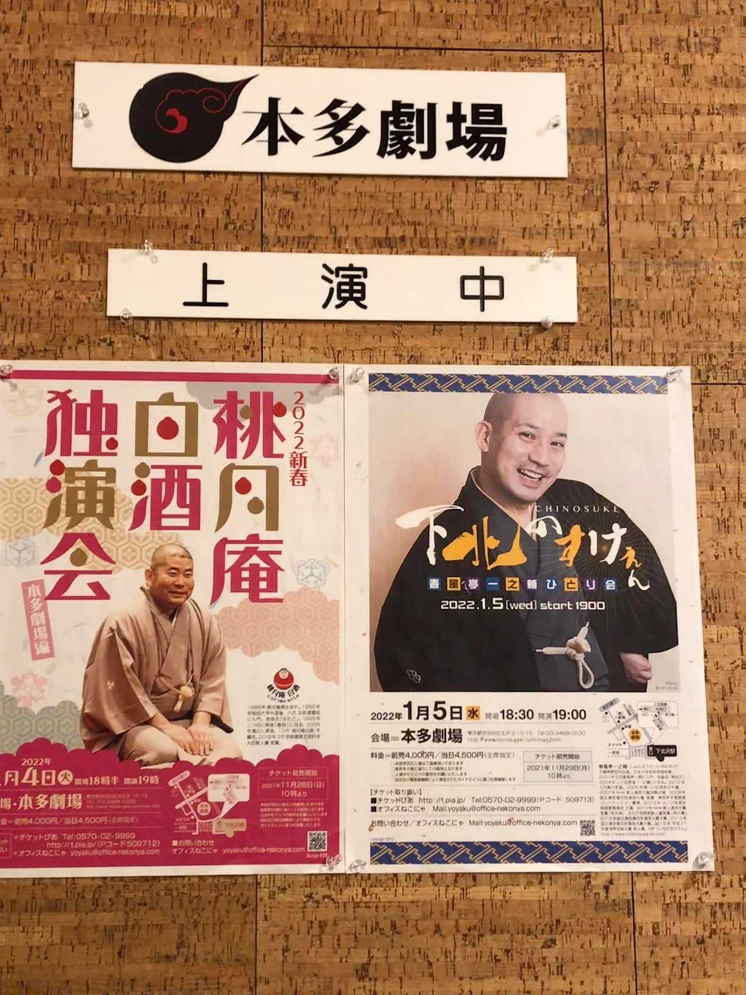 新年の初落語は桃月庵白酒さん独演会@本多劇場。白酒さんのネタは「家見舞」、「親子酒」、「御慶」の三席。いずれも爆笑ネタ。新年の本多劇場の高座は恒例になっているようで、白酒さんの独演会は4,5回目かと思うが白眉の出来。「親子酒」は枝雀さんの高座、「御慶」は志ん朝さんの高座を思い出しながら、お聴きした。特に、「御慶」はお腹が捩れそうな楽しさ、笑い。志ん朝さんの「御慶」は、白酒さんが落語にハマるきっかけにもなった演目だとのこと。「烏(からす)カーで夜が明けて」元旦。裃(かみしも)を付けて家を飛び出す八五郎。明るく弾ける「テヘヘへっ!」と八五郎を演じる志ん朝さんの声に魅了され、落語の道を志したらしい。ラジオの音声の27分10秒くらいに白酒さんの時の細かな描写が聴ける。「1979.12.08 三百人劇場 志ん朝の会第13回」の御慶の音源では35分33秒あたりが明るく弾ける「テヘヘへっ!」が聴ける瞬間。その少し前の市ヶ谷の古着屋”あまざけ屋(屋号)”に行って、裃から下着まで一式を揃えてあたりから聴くと、より楽しめる。マクラは前日1/3に浅草演芸ホールからNHKに出演した際のスリッパ(演芸ホールの便所スリッパ)の話、雲助一門の忘年会の幹事、馬石さんの仕切り振り(奢り)、中華料理のお店の深いスリット、龍玉さんの毒づき振り。どれも楽しい。ちなみに、NHKでの演目は「ざるや」。2022年1月4日[火] 桃月庵白酒独演会 ~本多劇場編~一. 開口一番「手紙無筆」三遊亭ニ之吉一.「家見舞」桃月庵白酒一.「親子酒」白酒<仲入り>一.「加賀の千代」桃月庵こはく一.「御慶」白酒