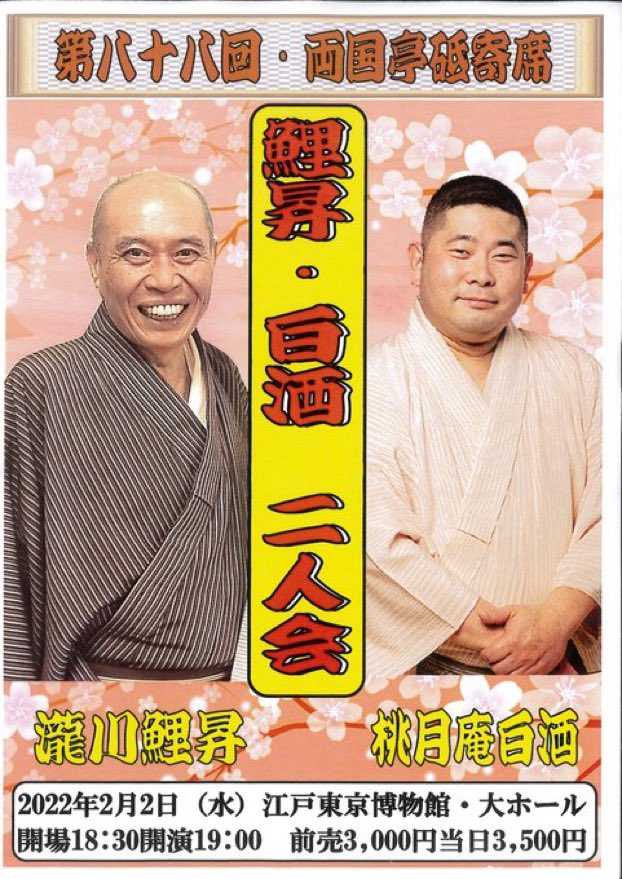 蓮田の鰻の後は「両国亭砥寄席 鯉昇・白酒 二人会@江戸東京博物館 大ホール 」。高速道路が混雑し、間に合うか微妙だったが、開口一番の杏寿ちゃんの「道具屋」に間に合った。江戸東京博物館がJRの駅から結構遠いので、早足で。杏寿ちゃん、美人でビックリ。入門前はNHKの朝ドラ「純と愛」(ヒロインは夏菜さん)に出ていた女優さんらしい。なるほど、美人なわけだ。声の張りも良く、要注目。持ちネタが増えれば、人気が出そう。白酒さんの「馬の田楽」では田舎訛り全開の白酒さんワールド炸裂。「2022年1月29日(土)「ザ・桃月庵白酒 其の八 ライト」@よみうり大手町ホール」の「木乃伊(ミイラ)取り」の清造に引き続き、白酒さんの独壇場の至芸を生で観れて嬉しい。鯉昇さんの「二番煎じ」も大熱演。獅子鍋を実に美味しそうに食べる仕草、声は見事。お昼は鰻で満腹だったお腹も空きまくっていたので、グーグー鳴る。臨場感、満点。仲入り後の、鯉昇さんの一席は「鰻屋」。あれ、我が家のお昼が鰻だったのを観ていましたか?といいたくなるタイミングの良さ。「鰻屋」では誰も鰻が食べられないが。。。三三さんの「素人鰻」を思い出す。「二番煎じ」が長演だったので、主催者から「マキ」をお願いされて、活きの良い鰻に導かれて「マキ」で高座を降りる鯉昇さんの芸、技。ラストは白酒さんの「明烏」。時次郎の二宮金次郎を引き合いに出しながら、泣きじゃくる仕草、セリフ。抱腹絶倒で涙まで出てしまう大爆笑。「書を捨てよ街に出よ」と寺山修司のフレーズを入れるインテリジェンスは白酒さん、ならでは。2022年1月4日[火] 桃月庵白酒独演会 ~本多劇場編~の「御慶」も大いに笑わせていただいたが、今日の「明烏」も実に楽しい1席。2022/2/2 第八十八回 両国亭砥寄席 鯉昇・白酒 二人会@江戸東京博物館 大ホール 「道具屋」 金原亭杏寿「馬の田楽」 桃月庵白酒「二番煎じ」 瀧川鯉昇仲入り「鰻屋」 鯉昇「明烏」 白酒