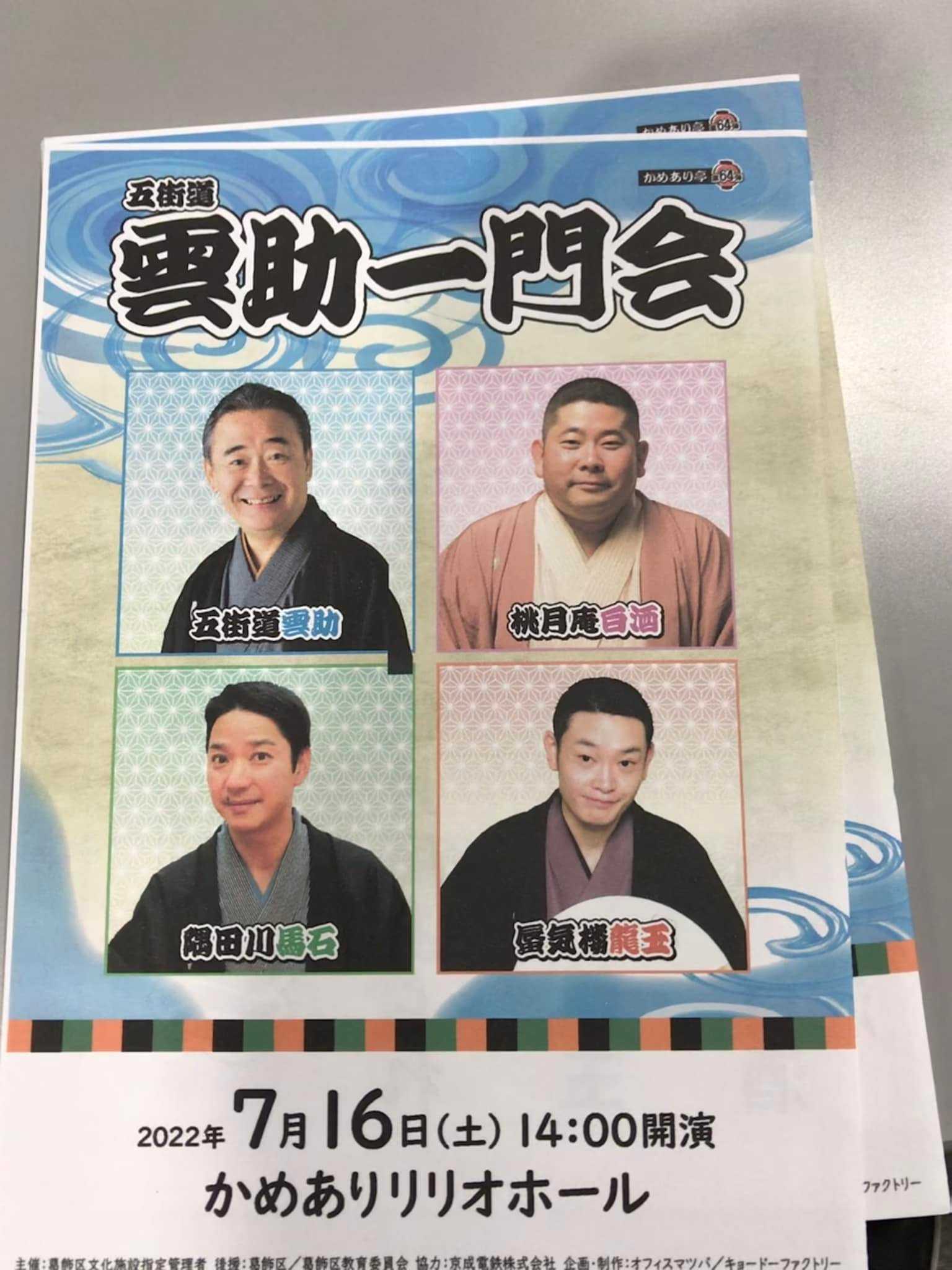 ダブルヘッダーの第一試合は亀有のリリオホールで、 五街道雲助一門会。贔屓の白酒さんは「鰻の幇間」。白酒さんの「鰻の幇間」は初めてかも? 三三さん、一之輔さんの「鰻の幇間」もイイが、今日の白酒さんは随所に細かい工夫があって、「本寸法」。マクラで、雲助師匠が「美味しい肉団子弁当」に釣られて「トリ(大掃除役)」を引き受けた内幕を語る。事実は分からないが、何となく雲助一門のホンワカさが分かる。ちなみに、「肉団子弁当」と海鮮弁当を選べたようだが、白酒さん、馬石さん、龍玉さんは師匠に倣って、皆「肉団子弁当」を選んだ由。馬石さんの「松曳き」は初めて聴く噺。端正で流麗な話運び。「妾馬(八五郎出世)」と粗筋はほぼ同じで、短めにした塩梅。一昨日の7/14が馬石さんのお誕生日だったようだが、雲助一門で誰一人「おめでとう」と言わない次第。「トリ(大掃除役)」の雲助師匠は正に「本寸法」の「もう半分」。唄や踊りの素養が無ければ、出来ない境地。志ん朝さん、小三治さん、十代金原亭目馬生さんの「もう半分」がYoutubeにあったので、復習したい。雲助師匠の師匠の馬生さんの「もう半分」は殊に楽しみ。《2022 Jul 16th Sat / 五街道雲助一門会@かめありリリオホール》一.開口一番「つる」桃月庵あられ一.「もぐら泥」蜃気楼龍玉一.「鰻の幇間」桃月庵白酒仲入り一.「松曳き」隅田川馬石一.「もう半分」五街道雲助参考)今、調べたら一門会で雲助師匠がトリを取るのは、十年振り。2012年10月10日 五街道雲助一門会@横浜にぎわい座たらちね/柳家緑太粗忽の使者/隅田川馬石錦の袈裟/桃月庵白酒仲入り鮑のし/蜃気楼龍玉つづら/五街道雲助