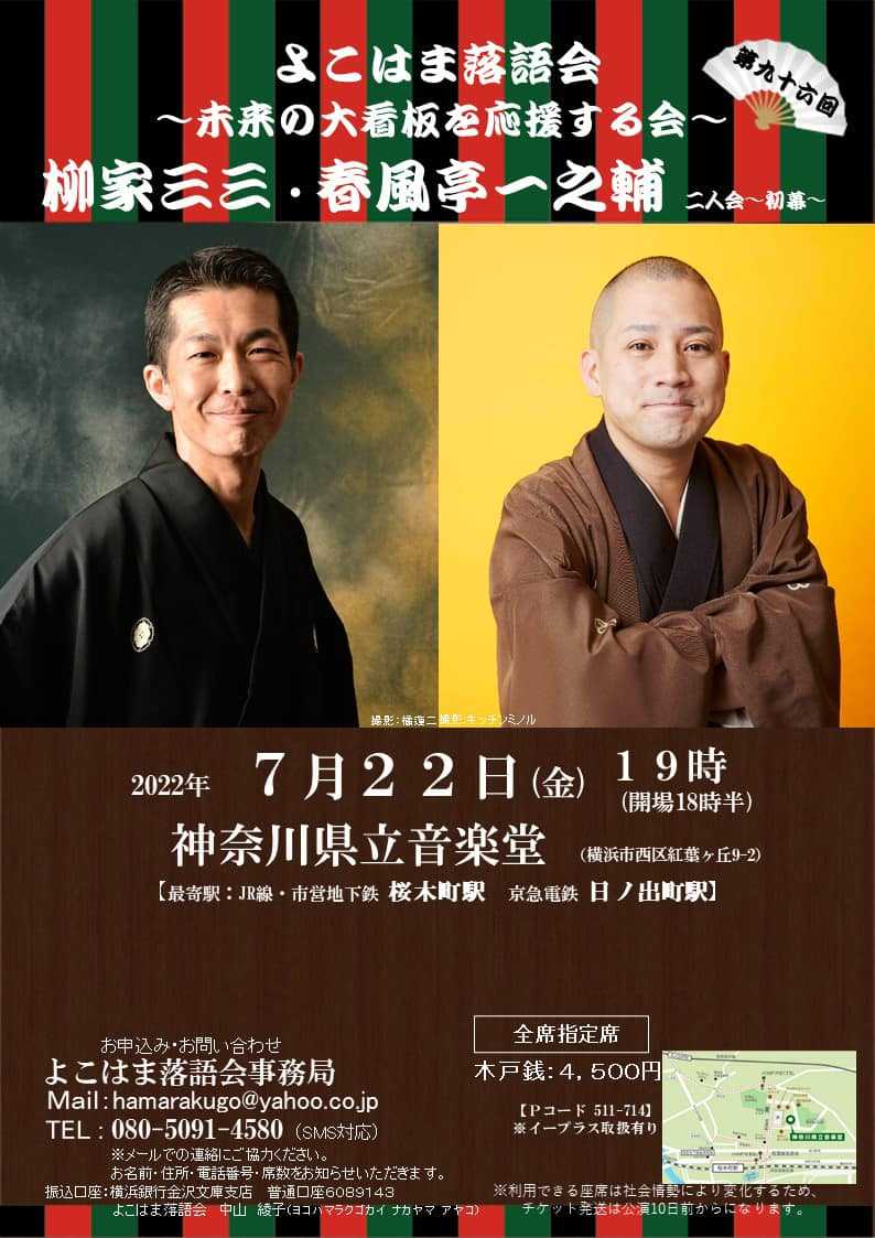 本日は三三さんと一之輔さんの落語を聴きに神奈川県立音楽堂に参上!丁度、一之輔さんが出る予定だった2022/7/7@日経ホール J亭スピンオフ企画23 白酒・一之輔 大手町二人会 【産経新聞社】からコロナでお休みになった一之輔さん。元気一杯で、十八番の「夢八」から。マクラは奥さんもコロナに罹って、愛と憎悪の「半地下」での10日間の療養生活。お子さんの作ってくれる御飯のおかずの質が段々下がるのはリアル。奥さんが夢に出て来る話も「夢八」に繋がって、流石の腕前。軽い、一之輔さんの「普段の袴」を挟んで、トリの三三さんは「文違い」。冒頭、廓噺ぽいので「品川心中」、「居残り佐平次」、「磯の鮑」、「三枚起請」辺りを予想するが、内藤新宿の女郎”お杉”に真夫(まぶ)気取りで通ってくる日向屋の”半七”まで出て来て「文違い」と確定。今日の開口一番の春風亭いっ休さんの「弥次郎」。調子といい、噺の運びといい、小話の挟み方といい、見事。いっ休さんの開口一番。5回以上いろんな噺を聴いているが、今度、真打になる春風亭一蔵さん、柳亭市弥さんよりも上手い。ついでに言えば、桂宮治さんよりも上。3人を2つ目に戻して、いっ休さんを真打にすべきかと思っている。2022年7月22日(金)よこはま落語会 三三・一之輔二人会@県立音楽堂一.開口一番 いっ休/弥次郎一.三三/道灌一.一之輔/夢八<仲入り>一.一之輔/普段の袴一.三三/文違い