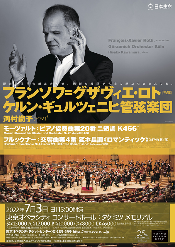今日はダブルヘッダー。第一試合はクラシックの河村尚子さんのピアノ🎹を聴きにタケミツメモリアル(東京オペラシティーコンサートホール)に参上!予約を頑張ったかどうか全く覚えていないが、5列目の中央からやや左寄りの席で河村さんの両手共に良く見えて、中々の好位置。ブルックナー:交響曲第4番も指揮のロトさんの統率力が凄く、変幻自在な抑揚があって見応え、タップリ。クラシックの「沼」の一端に触れたような心持。7/3[日]フランソワ=グザヴィエ・ロト指揮 ケルン・ギュルツェニヒ管弦楽団[出演]フランソワ=グザヴィエ・ロト(指揮)河村尚子(ピアノ)ケルン・ギュルツェニヒ管弦楽団[曲目]第1部モーツァルト:ピアノ協奏曲第20番 ニ短調 K466*(ソリスト:河村尚子(Pf))[ソリストアンコール] 河村尚子(Pf)・シューベルト:楽興の時 第3番 D780-3第2部ブルックナー:交響曲第4番 変ホ長調《ロマンティック》(1874年第1稿)