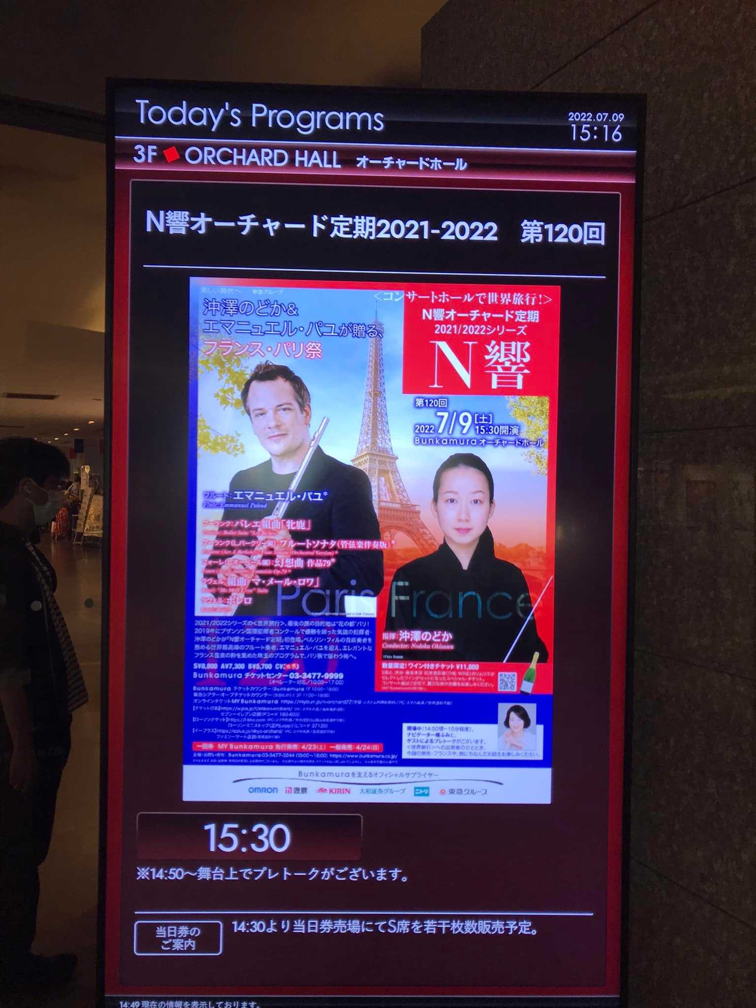 本日はオーチャードホールにクラシックを聴きに参上!2022年7月9日(土) 開演15:30 N響オーチャード定期 2021/2022シリーズ「コンサートホールで世界旅行!」第120回指揮:沖澤のどかConductor : Nodoka Okisawaフルート:エマニュエル・パユFlute : Emmanuel Pahud※印の曲はソリストと共に演奏プーランク:バレエ組曲「牝鹿」Poulenc : Ballet Suite "Les Biches"プーランク(L.バークリー編):フルートソナタ(管弦楽伴奏版)※Poulenc(Arr. L.Berkeley) : Flute Sonata (Orchestral Version) *フォーレ(L.オーベール編):幻想曲 作品79 ※Faure(Arr. L.Aubert) : Fantaisie Op.79 *ラヴェル:組曲「マ・メール・ロワ」Ravel : "Ma Mère L'oye" Suiteラヴェル:ボレロRavel : Boléro