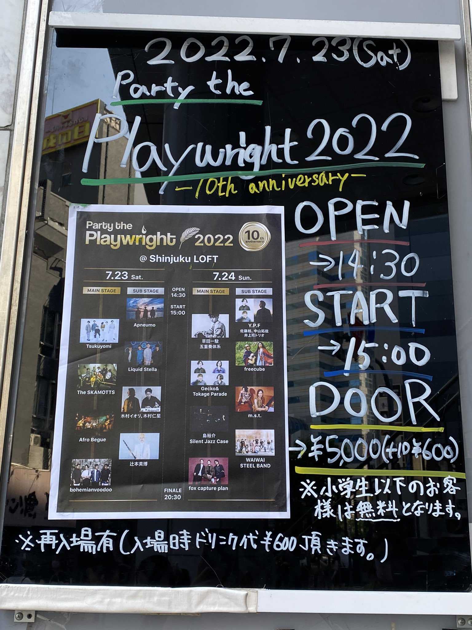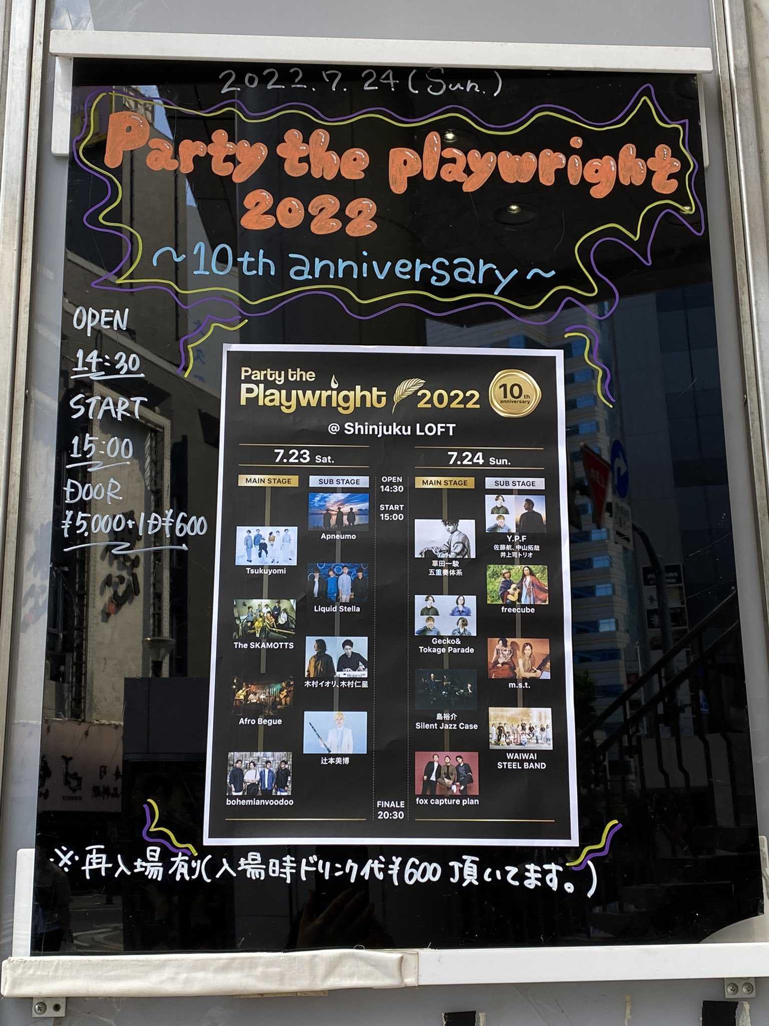 Playwrightさん、10周年、おめでとうございます!2022 Jul 23rd Party the Playwright 2022 -10th Anniversary- 1st Day@新宿LOFTApneumo1. pray2. pedestrian's wharf3. skyscraper4. lay it on5. unknown years6. moon satellite7. supersonic8. steppeTsukuyomiLiquid Stellathe SKAMOTTS木村イオリ,木村仁星Afro Begue辻本美博bohemianvoodoo