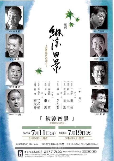 今週はBrad Mehldau三昧の予定だったが、7/8に来日公演が全てキャンセル。急遽、リセールで良い席が買えたので、納涼四景(上)@国立劇場小劇場に行先変更。2022/7/11(月) 納涼四景(上)@国立劇場小劇場一.開口一番「手紙無筆」柳亭左ん坊一.「天災」三遊亭兼好一.「百川」柳家三三一.「大山詣り」五街道雲助仲入り一.「船徳」柳家さん喬
