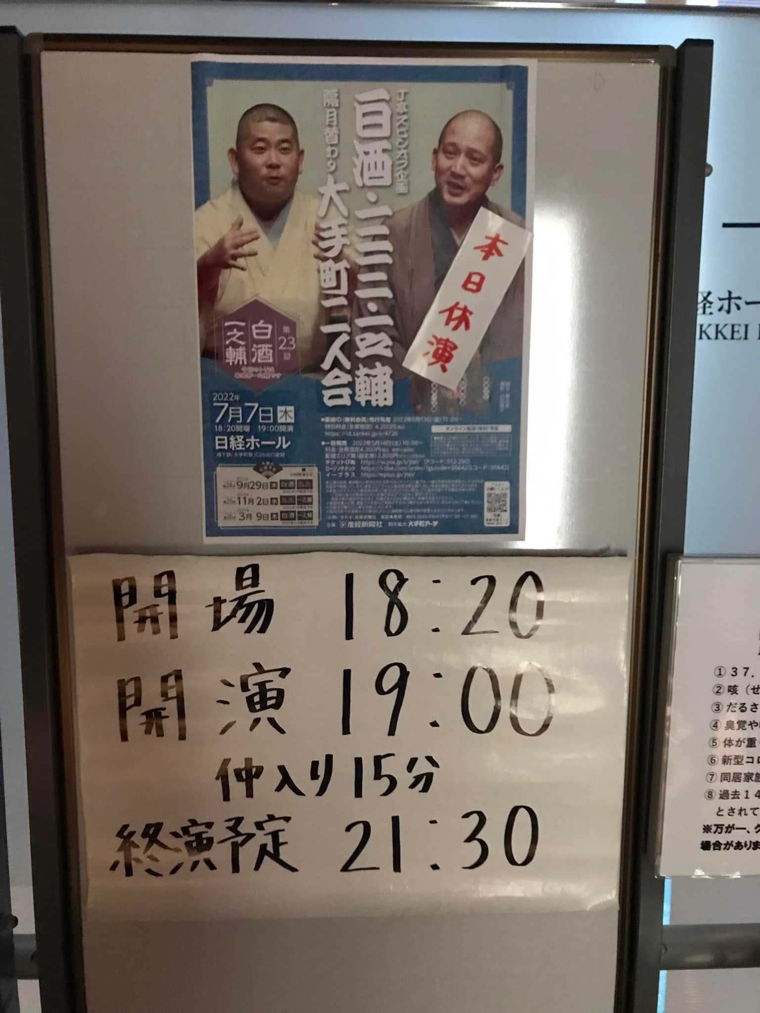 今日は落語会。桃月庵白酒さんと春風亭一之輔さんの二人会の予定が一之輔さん急病(第7波🌊?)で白酒さんの独演会的なプログラムに急遽変更。白酒さん予定の2席に加えて1席で、3席。定番の「代書屋」に続けて、季節に合ったネタ「青菜」をコンパクトに。白酒さんの「青菜」はおそらく初めてで、外連味なく爽快な味わい。中入りの後の「臆病源兵衛」はやはり多分初めてで、お化けネタでこれも時節に合う。実力者の一之輔さんの代役(代演)で柳亭市弥さん。さすがに荷が重いが、9月下席から八代目柳亭小燕枝を襲名して真打昇進前の襲名に纏わるお話、先代の小燕枝、六代目柳亭小燕枝師匠への挨拶、市馬会長から昇進祝いに着物を3着いただく、お話などマクラも工夫を凝らす。2022/7/7@日経ホール J亭スピンオフ企画23 白酒・一之輔 大手町二人会 【産経新聞社】「たらちめ」いっ休「あくび指南」市弥「代書屋」白酒「青菜」白酒〜「紙入れ」市弥「臆病源兵衛」白酒