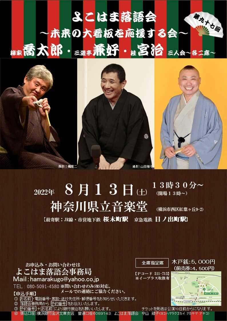 本日はダブルヘッダー。第一試合は喬太郎さん、兼好さん、宮治さんの三人会@神奈川県立音楽堂。喬太郎さん、相当膝が痛いそうで主催者が見台を用意。見台無しでは額に油汗が出るほどらしいが、見台のお蔭で「擬宝珠」のマクラから快調。池袋から横浜までの湘南新宿ライナーでの出来事、桜木町からのタクシーでの運ちゃんとの会話など話が止まらない。仲入り前の喬太郎さんの持ち時間は30分くらいで、既に20分弱。ここでネタを12分程度の「擬宝珠」に決めたか。ちゃんと前振りで、「ギザ10と言われる10円玉が発行されていたのは、1951年から1958年までの7年間」の頃の話をして、サゲの六升(緑青)に繋ぐ。見事。「擬宝珠」の若旦那が病気になって寝込んでしまった。熊さんは親に頼まれて、病気の原因、思い悩んでいる事を聞き出そうと若旦那の部屋にやって来た。若旦那は気も消沈して寝込んでいた。なかなかその悩み事を口にしなかった。でも、熊さんは落語通なので解った。女の子だったら「崇徳院」でしょ。違っていたが、若旦那だから「幾代餅」でもないし、あ!、みかんが食べたい、でしょ。あたりは、いつものことだろうが会場は笑いの渦の中。2022年8月13日(土)喬太郎・兼好・宮治 三人会@神奈川県立音楽堂たらちね:宮治磯の鮑:兼好擬宝珠:喬太郎<仲入り>諜報員メアリー:喬太郎ちりとてちん:宮治陸奥間違い:兼好備忘録)急いで喬太郎さんが向かった、8月13日 #鈴本演芸場 さん喬権太楼特選集さん花 初天神仙志郎仙成 太神楽甚語楼 千早ふる菊丸 宗論ダーク広和三三 釜泥喬太郎 諜報員メアリー新治 魂切り源五郎小菊 粋曲権太楼 青菜正楽 紙切りさん喬 お直し