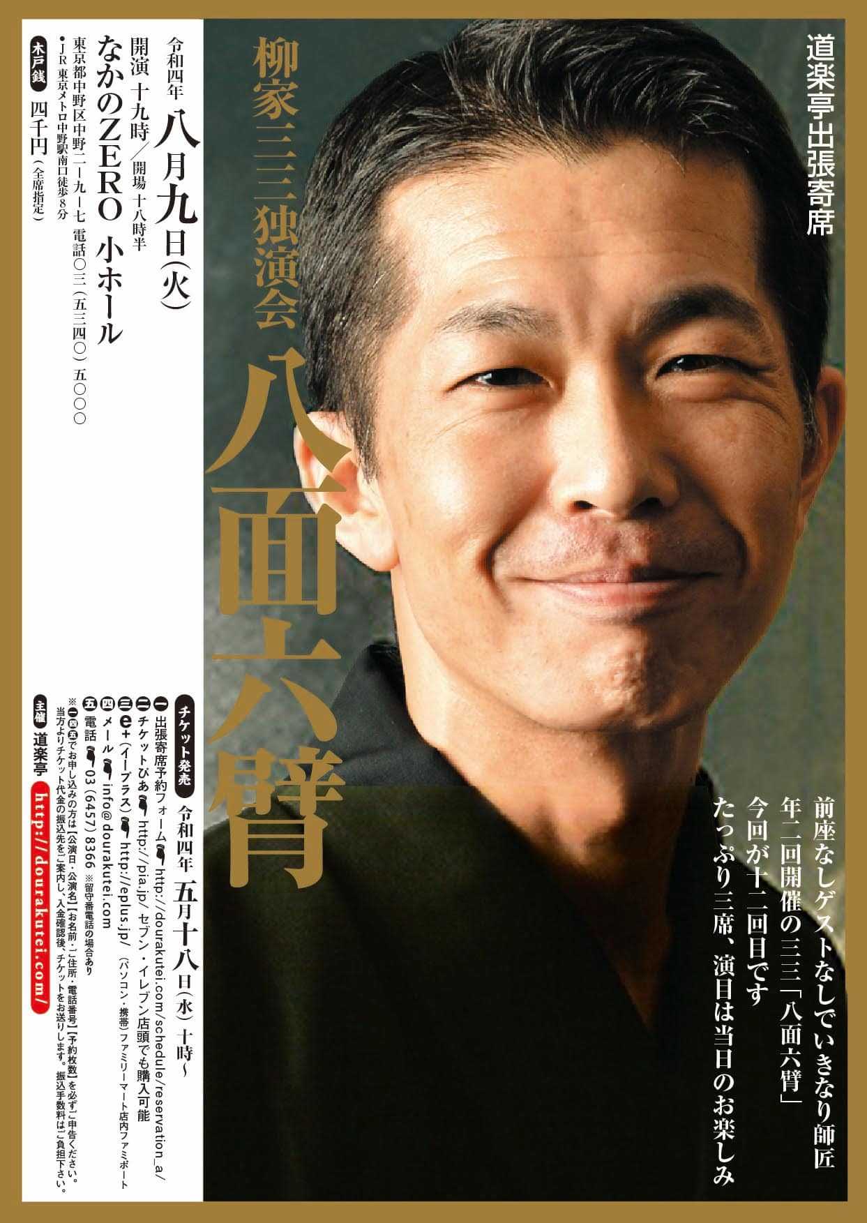 今日はなかのZEROホールに柳家三三さんの落語を3席聴きに参上!2022年8月9日 道楽亭出張寄席★柳家三三独演会★『八面六臂』12@なかのZERO小ホール「三人旅」三三「五貫裁き」三三 ~仲入り~「年枝の怪談」三三
