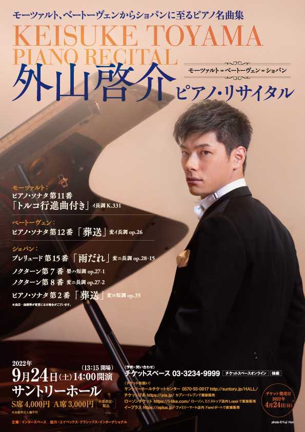 初めて、外山啓介君のピアノ・リサイタルを聴きにサントリーホール 大ホールに参上。コンセプトは、モーツァルトのピアノ・ソナタ第11番「トルコ行進曲」から、ベートーヴェンのピアノ・ソナタ第12番「葬送」、そしてショパンのピアノ・ソナタ第2番「葬送」という、古典派からロマン派にかけてのピアノ・ソナタの変化や進化を楽しむこと。随所に外山君の「ショパン愛」を感じる素晴らしいリサイタル。時折魅せる笑顔や曲の説明に彼のお人柄の良さも伝わった。2022/09/24 (土) 外山啓介ピアノ・リサイタル モーツァルト~ベートーヴェン~ショパン@サントリーホール 大ホール第1部モーツァルト:ピアノ・ソナタ第11番 イ長調 K. 331 「トルコ行進曲付き」ベートーヴェン:ピアノ・ソナタ第12番 変イ長調 Op. 26 「葬送」第2部ショパン:プレリュード第15番 変ニ長調 Op. 28-15 「雨だれ」ショパン:ノクターン第7番 嬰ハ短調 Op. 27-1ショパン:ノクターン第8番 変ニ長調 Op. 27-2ショパン:ピアノ・ソナタ第2番 変ロ短調 Op. 35 「葬送」Encoreショパン:ノクターン第20番「遺作」ショパン:モデラート(アルバムの綴り)Encoreショパン:ノクターン第20番「遺作」ショパン:モデラート(アルバムの綴り)