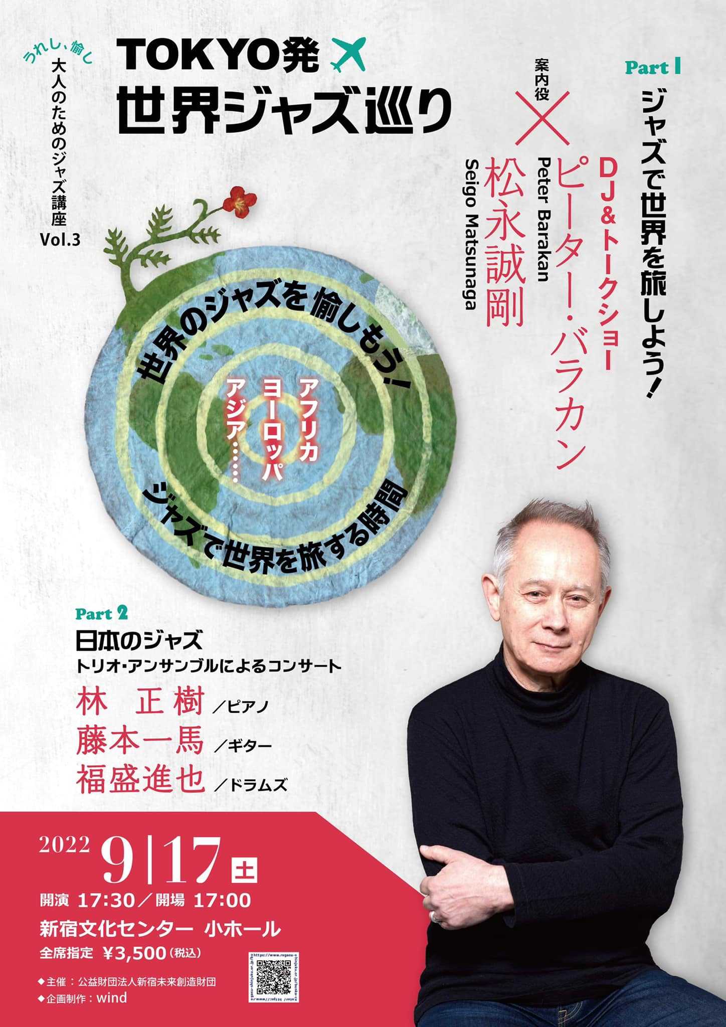 新宿文化センター小ホールでのピーター・バラカン レクチャー公演 「うれし、愉し大人のためのジャズ講座 vol.3― TOKYO発 世界ジャズ巡り♪」に参戦。第一部:バラカンさんと松永誠剛さんが“ピンポンDJ”で曲紹介。第二部:pf林正樹さん、gt藤本一馬さん、ds福盛進也さんのトリオ。Teal、flow、オネバ、yuragu、spectacular、Prayerの6曲。昨日9/16、一昨日のBob Jamesトリオとは全く違うが静謐なトリオの見事なInterplay。絶賛する松永誠剛さんの紹介で今日のライブが実現。第一部:世界中の気になる音楽をバラカンさんと松永誠剛さんのお2人で紹介。少しだけ知っていたのは、ベースNiels-Henning Ørsted PedersenとピアノTigran Hamasyanのみ。マダマダ知らないことが一杯。⑥はよく聞き取れなかったので、かなり怪しい。①Jeg Gik Mig Ud en Sommerdag(ある夏外に出かけた):Niels-Henning Ørsted Pedersen、Oscar Petersonトリオのベース、"Kenny" Drewとも共演。Pedersenの師匠はOscar Pettiford。②Ray of Lights: ピアノTigran Hamasyan。アルメニアの鬼才のピアニスト。③Jazz pa Svenska(スウェーデンのフォークソングのジャズアレンジ):ピアノJan Johansson。昔のサントリーのCM曲のようなブルジーな味わい④ブルガリアの婚礼の曲:クラリネット イヴォ・パパゾフ(Иво Папазов)⑤The Melody Of Rhythm:バンジョーBela Fleck/タブラZakir Hussain/ダブルベース奏者Edgar Meyer。ベラ・フレックとエドガー・マイヤーの紡ぎだすアメリカン・ルーツ・ミュージック直系のメロディに、インド伝統音楽のリズムが高次元で融合!リズミックな指揮に定評のあるレオナルド・スラットキン率いるデトロイト交響楽団⑥Nomad Spirit:アルメニアを代表するドゥドゥク(縦笛)奏者のジヴァン・ガスパリアン。モロッコ出身のゲンブリ奏者、マジッド・ベッカス。エスノ・プログレッシブ・ロック・グループ、エンブリオとも共演している、南インド出身のパーカショニスト⑦Grassy Park Requiem:Robbie Jansen。2010年に亡くなったsax奏者Robbie Jansen。Abdullah Ibrahim(Dollar Brand、ピアニスト、作曲家)とも共演第二部:1.Teal - 林正樹さんオリジナル2.flow - 藤本一馬さんオリジナル3.オネバ - 福盛進也さんオリジナル4.yuragu - 林正樹さんオリジナル 5.spectacular - 福盛進也さんオリジナルEnc6.Prayer - 藤本一馬さんオリジナル