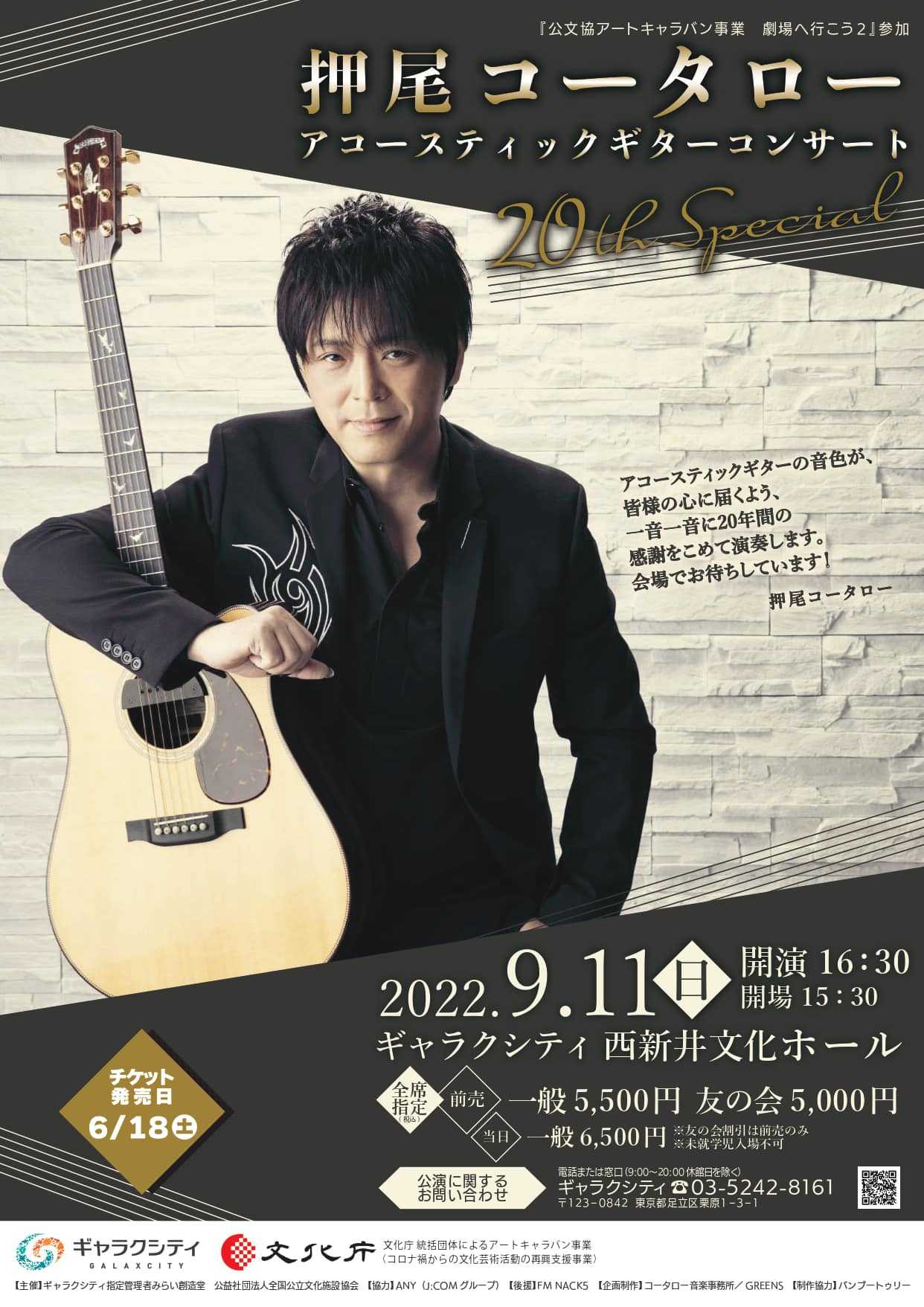 今日は押尾コータローさんのギター🎸を聴きにギャラクシティ西新井文化ホールに参上!今のMCのスタイルをアドバイスしてくれた恩人、河島英五さんとの思い出、アリスの名曲も入れた「ひとりメンバー紹介」など楽しさ一杯のライブ。2022 Sep 11th Sun 押尾コータローアコースティックギターコンサート20th Special@ギャラクシティ西新井文化ホール 第1部01.GOLD RUSH02.太陽のダンス03.ナユタ04.あの夏の白い雲05.黄昏06.河島英五さんの思い出~酒と泪と男と女07.風の詩 - キム・ヒョンジュンさんが目の前で弾いてくれたエピソードも。キムさんはコラボレーション楽曲「誰そ彼 ~黄昏~」に参加。05-07は自慢のOLD gibsonで弾く。08.蜃気楼第2部09.翼 ~You are the HERO~10.My Guitar, My Life - 9/26発売の新アルバム「20th Anniversary "My Guitar, My Life"」のタイトル曲11.メンバー紹介~チャンピオン/ アリスの独唱もあり。紹介の順はベース,エレキギター,三味線,フォークソング(チャンピオン),小太鼓,ドラム<会場でWave>12.Legend~時の英雄たち~Enc13.Together!!!14.上を向いて歩こう ~ 見上げてごらん夜の星を