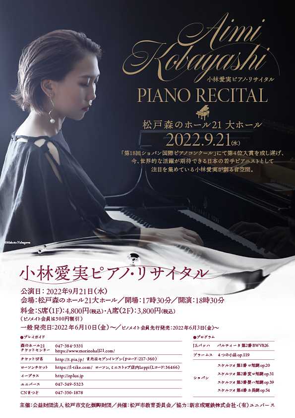 本日は小林愛実さんのピアノ🎹リサイタルを聴きに松戸の森のホール21に参上!東府中では愛実さんの手元が見えなかったが今日は両手とも見える良席。2022年9月21日(水) 小林愛実 ピアノ・リサイタル@森のホール21(松戸)第1部J.S.バッハ:パルティータ第2番 ハ短調 BWV8261. シンフォニア (Sinfonia)2. アルマンド (Allemande)3. クーラント (Courante)4. サラバンド (Sarabande)5. ロンドー (Rondeaux)6. カプリッチョ (Capriccio)ブラームス:4つの小品op.1191.間奏曲 ロ短調 Intermezzo. Adagio2.間奏曲 ホ短調 Intermezzo. Andantino un poco agitato3.間奏曲 ハ長調 Intermezzo. Grazioso e giocoso4.ラプソディ 変ホ長調 Rhapsodie in E-Flat Major. Allegro risoluto第2部ショパン:スケルツォ第1番〜第4番スケルツォ第1番 Op.20 ロ短調 Presto con fuocスケルツォ第2番 Op.31 変ロ短調 Prestoスケルツォ第3番 Op.39 嬰ハ短調 Presto con fuocoスケルツォ第4番 Op.54 ホ長調 PrestoEncoreショパン:24のプレリュード(前奏曲集) 第17番変イ長調,Op.28-17 24のプレリュード(前奏曲集)第4番ホ短調,Op.28-4 ノクターン第20番「遺作」嬰ハ短調 Nocturne in C-sharp minor(No.20)
