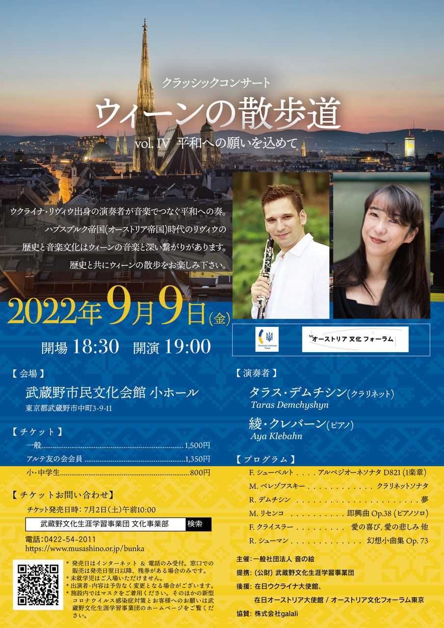ダブルヘッダー第2試合はウイーンの散歩道@三鷹。クラリネットのタラス・デムシチンさんは故郷ウクライナのご実家のあるリヴィウ(西部の都市)に2021年12月に帰国。2月に戦争が始まってしまったので、来日が遅れ、やっと先週来日。素晴らしい音楽と共に、何がウクライナで起きているかもお話された。滅多に募金はしないが、あまりの惨状に些少の募金させていただいた。一万円札を入れる方も結構おられ、募金箱の前には長蛇の列。2022年9月9日(金曜日)ウィーンの散歩道 vol.IV 平和への願いを込めて@武蔵野市民文化会館 小ホールタラス・デムシチン(クラリネット)綾・クレバーン(ピアノ)第1部シューマン:幻想小曲集 Op.73 Schumann: Fantasy Pieces, Op. 73Maksim Berezovsky Sonata C major Violin Piano i ii iiiR.デムチシン:夢第2部M.リセンコ:即興曲 Op.38(ピアノソロ)Mykola Lysenko - Impromptu in the Style of Chopin, Op.38クライスラー:愛の喜び、愛の悲しみ Kreisler Liebesleid Liebesfreudシューベルト:アルペジオーネソナタ イ短調 D.821(1楽章)Schubert: Sonata For Arpeggione And Piano In A Minor, D.821 - 1. Allegro moderatoアンコールクライスラー-美しきロスマリン Kreisler-Schön Rosmarin