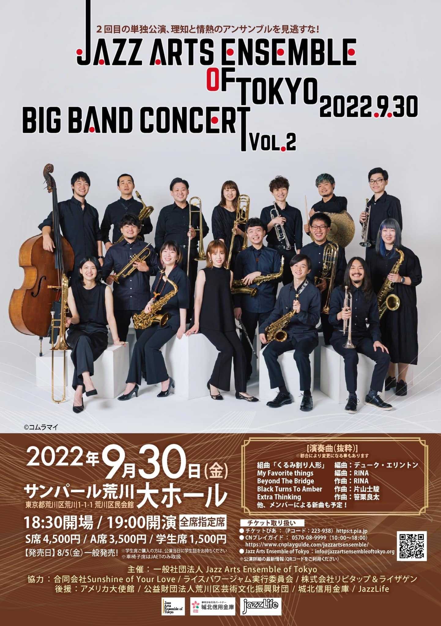 今日はRINA リナさんのピアノ🎹というかBig Bandを聴きにサンパール荒川に参上!<< 2022 Sep 27th BLUE NOTE TOKYO ALL-STAR JAZZ ORCHESTRA directed by ERIC MIYASHIRO with special guests LEE RITENOUR & DAVE GRUSIN@BLUE NOTE TOKYO>>, <<2022 Sep 28th JUNKO MORIYA ORCHESTRA with special guest ASAKO TOKI@丸の内COTTON CLUB>>に続いて、今週は何とBig Bandを3つも拝聴。どれも甲乙付け難い見事な内容。RINAさんアレンジの「1.My Favorite Things 」、RINAさん作「3.Not Yet 」、「7.Beyond the Bridge」、RINAさんのピアノソロなどWoo!と唸らされる場面がタップリの楽しいライブ。2022年9月30日(金)Jazz Arts Ensemble of Tokyo “BIG BAND” CONCERT Vol.2@サンパール荒川 大ホール第一部1.My Favorite Things - Richard Charles Rodgers/ arr. RINA2.The Nutcracker Suite (arr. Duke Ellington & Billy Strayhorn, 1941) - featuring jazz interpretations of the 1892 ballet "The Nutcracker" by Tchaikovsky2-1 "Overture" 〈小序曲〉2-2 "Toot Toot Tootie Toot (Dance of the Reed-Pipes)" 〈葦笛の踊り〉2-3 "Peanut Brittle Brigade (March)" 〈行進曲〉2-4 "Sugar Rum Cherry (Dance of the Sugar-Plum Fairy)" 〈金平糖の精の踊り〉2-5 "Entr'acte" 〈短い間奏曲〉2-6 "Volga Vouty (Russian Dance)" 〈ロシアの踊り〉2-7 "Chinoiserie (Chinese Dance)" 〈中国の踊り〉2-8 "Danse of the Floreadores (Waltz of the Flowers)" 〈花のワルツ〉2-9 "Arabesque Cookie (Arabian Dance)" 〈アラビアの踊り〉第二部3.Not Yet - RINA, 2022, 初演4.EXTRA THINKING - 笹栗良太, 2021 八王子のライブで好評を得た曲で2回目の演奏5.Cat Tricks - 鈴木瑤子, 2018 日本で初演6.Black Turns To Amber - 片山士駿, 2021 根本哲史君の原曲をラージアンサンブルに編曲7.Beyond the Bridge - RINA, 2021, 初演参考)Duke Ellingtonの楽団Duke Ellington – pianoWillie Cook, Fats Ford, Ray Nance, Clark Terry - trumpetLawrence Brown, Booty Wood, Britt Woodman - tromboneJuan Tizol - valve tromboneJimmy Hamilton - clarinet, tenor saxophoneJohnny Hodges - alto saxophoneRussell Procope - alto saxophone, clarinetPaul Gonsalves - tenor saxophoneHarry Carney - baritone saxophone, clarinet, bass clarinetAaron Bell - bassSam Woodyard - drums