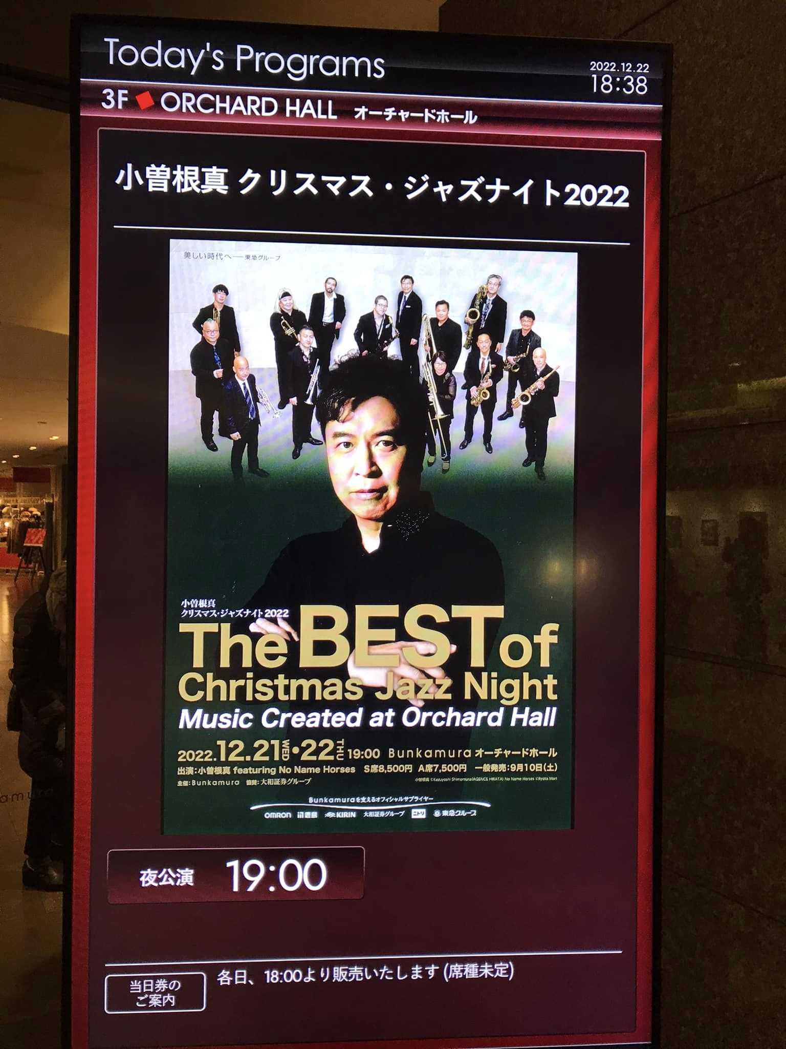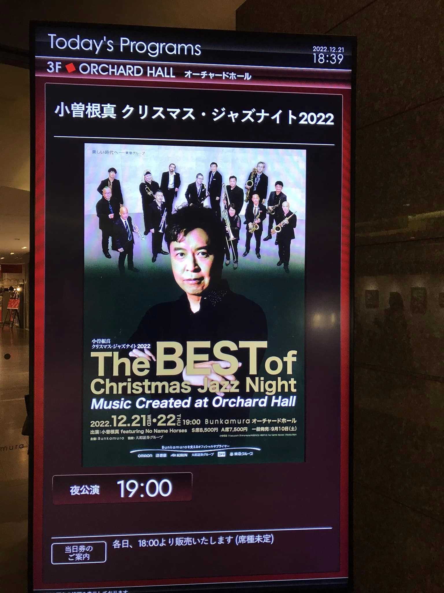 今日も小曽根さんのバンド、小曽根真 featuring No Name Horsesを聴きにBunkamuraオーチャードホールに参上。昨日は小曽根さんの手元が良く観える席で、今日は一列目中央でソリストの音を間近に味わえる好位置。小曽根さんの楽しそうな表情も満喫。ソリストは1.“Puzzle”tp:エリックさん→tb:中川さん→tp:岡崎好朗さん→as:池田さん→ds:信之介さん2.“Rhapsody in Blue”cl:岡崎正典さん→ts:三木さん→as:近藤さん→tp:木幡さん→tb:中川さん→b:健吾さん→ds:信之介さん3.“La Fiesta” (ゲスト:KAN君)b.sax:岩村さん→per:KAN君4.“The Okanagan Valley” tb:中川さん5.“Jean Pierre” (ゲスト:山岸君、KAN君)e.gt:山岸君→b.tb山城さん→tp:奥村さん6.“Gotta Be Happy” (ゲスト:山岸君、KAN君)ts:岡崎正典さん→ds:信之介さん→per:KAN君→e.gt:山岸君→tb:半田君→tp:エリックさん8.“Hymn to Freedom”小曽根さんのピアノソロ2022/12/22(木)19:00開演 小曽根真 featuring No Name Horses@Bunkamuraオーチャードホール小曽根真 (pf) エリック・ミヤシロ (lead tp)/木幡光邦 (tp)/奥村晶 (tp)/岡崎好朗 (tp)中川英二郎 (lead tb)/半田信英(tb)/山城純子 (b.tb)近藤和彦(lead as)/池田篤 (as)/三木俊雄 (ts)/岡崎正典 (ts)/岩持芳宏 (b.sax)中村健吾 (b)/高橋信之介 (ds)スペシャルメンバー:山岸竜之介 (e.gt)/Kan (per)第1部1.“Puzzle” (Makoto Ozone)2.“Rhapsody in Blue” (George Gershwin)第2部3.“La Fiesta” (Chick Corea)4.“The Okanagan Valley” (Oscar Peterson /Michel Legrand)5.“Jean Pierre” (Miles Davis)6.“Gotta Be Happy” (Makoto Ozone)Enc7.“Happy Xmas (War Is Over)” (John Lennon/Yoko Ono)8.“Hymn to Freedom” (Oscar Peterson)