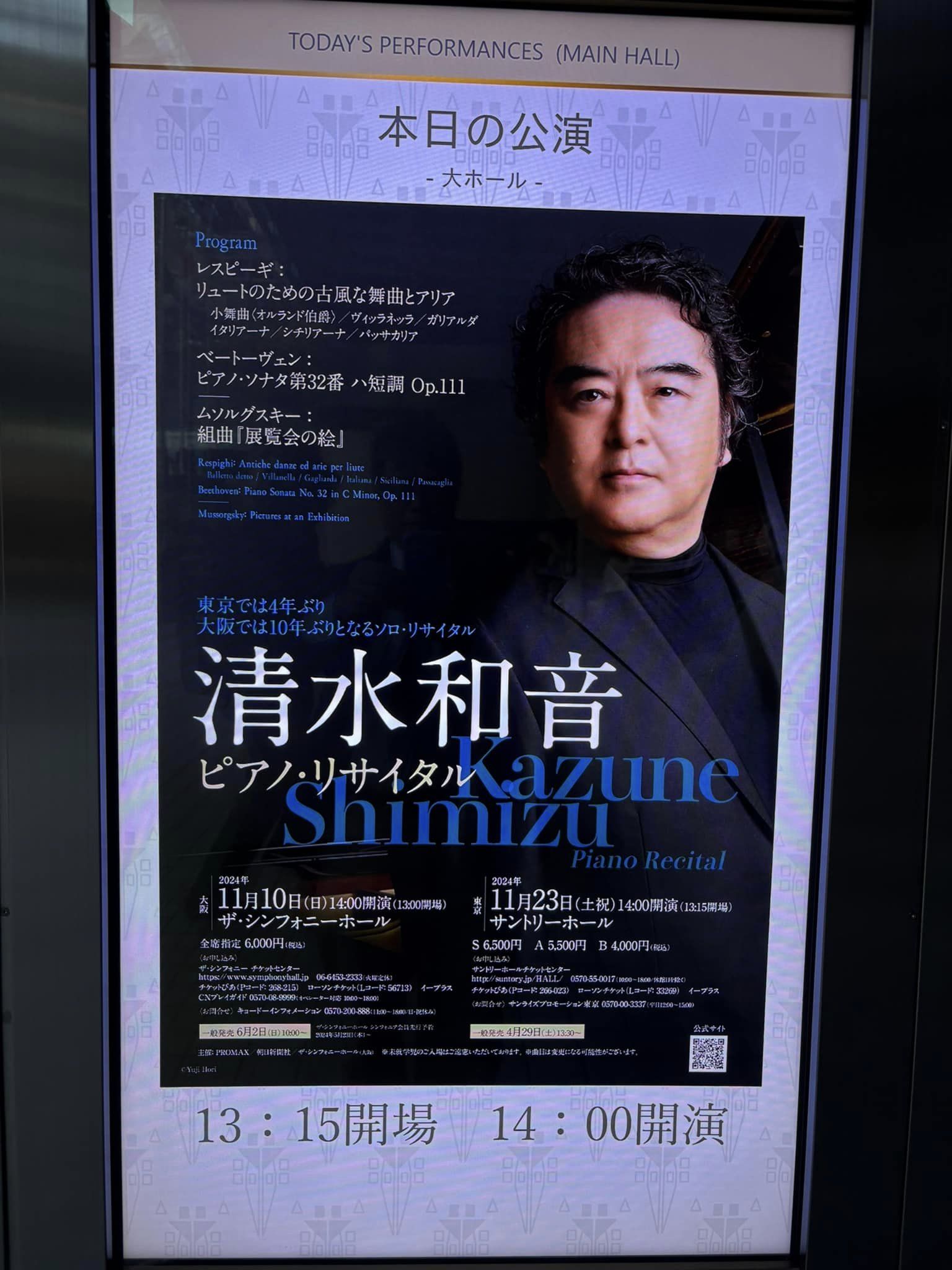 今日はダブルヘッダー。 第一試合は清水和音さんのピアノリサイタルを聴きにサントリーホールに参上! 2024年11月23日(土・祝) 清水和音 ピアノ・リサイタル@サントリーホール第1部レスピーギ:「リュートのための古風な舞曲とアリア」よりベートーヴェン:ピアノ・ソナタ第32番 ハ短調 Op. 111 第2部ムソルグスキー:組曲『展覧会の絵』 アンコール:ショパン:ノクターン第16番 Op. 55-2
