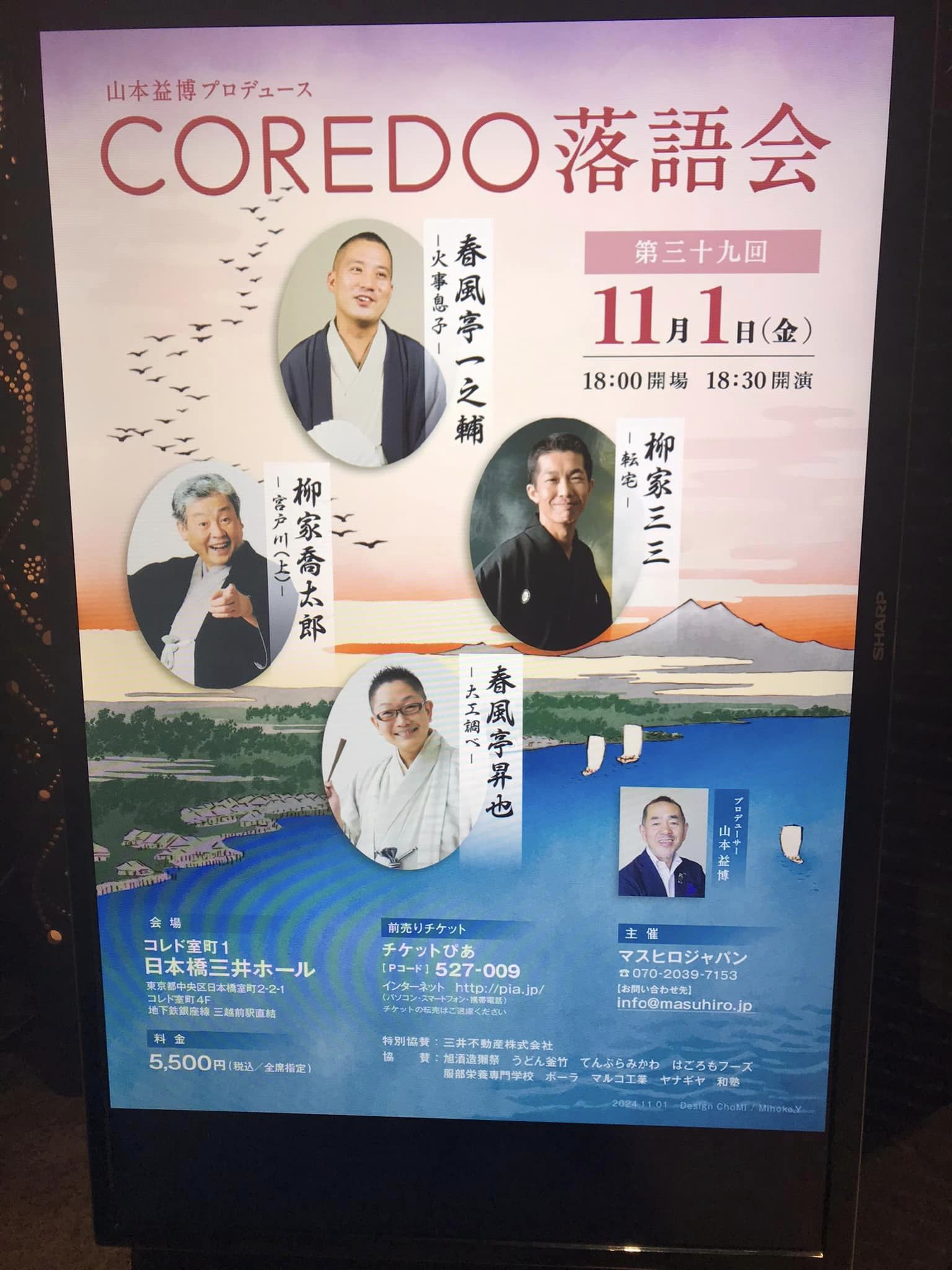 今日は三三さん、白酒🍶さん、一之輔さんの落語を聴きに日本橋三井ホールに参上! 喬太郎さんはご病気で欠席。代演は白酒さん。強烈な「幾代餅」。幾代太夫の来る筈だったお客が来なくて清蔵が幾代と会えることになるクダリ「来る予定だった旦那が新潟で入院して…」にアドリブ。白酒さんらしい趣向は見事。2024/11/1(金) 第39回「COREDO落語会」@日本橋三井ホール のめる 柳家小きち大工調べ 春風亭昇也転 宅 柳家三三幾代餅 桃月庵白酒 【仲入り】 家事息子 春風亭一之輔