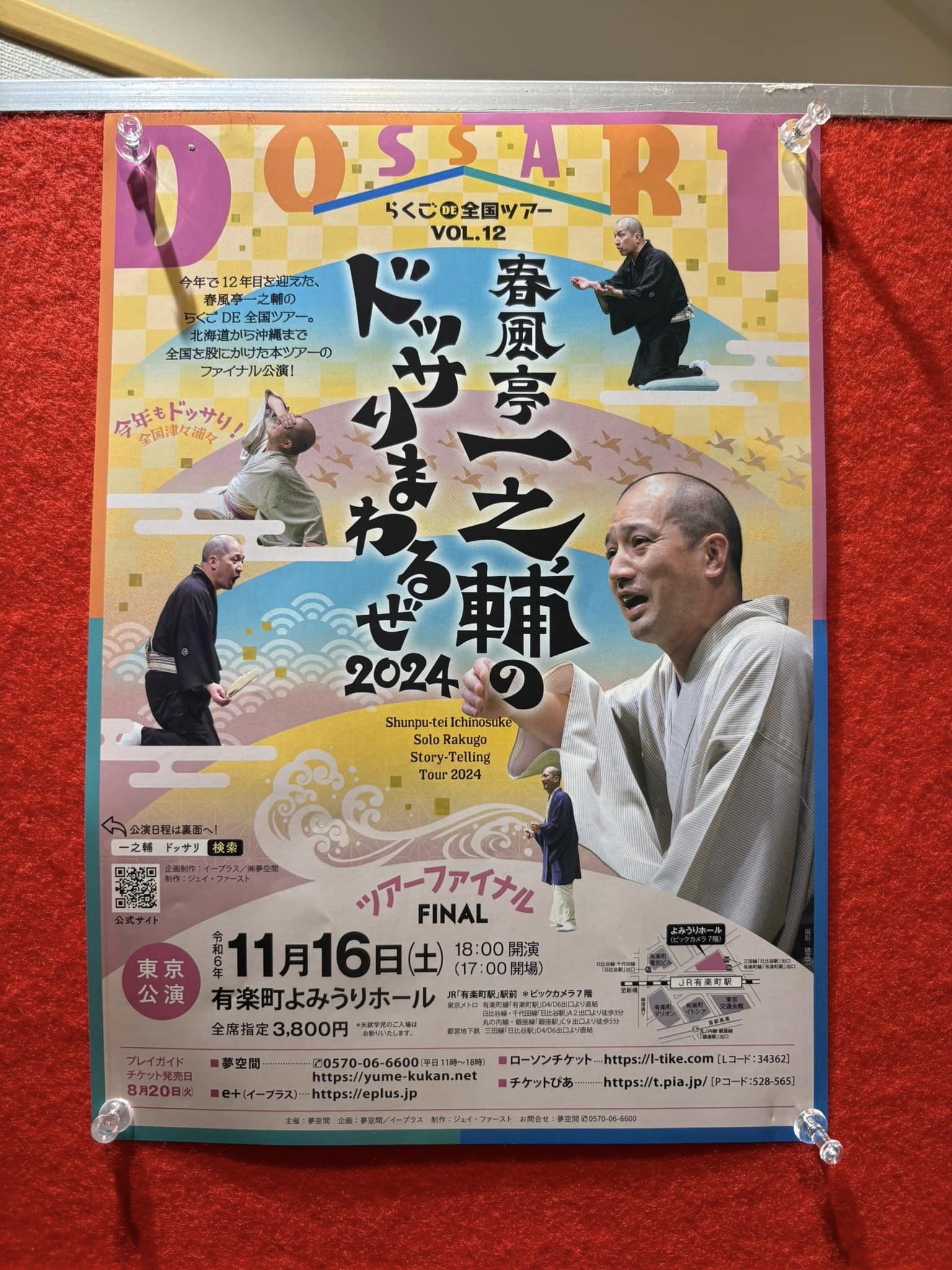 今日は春風亭一之輔さんの独演会を聴きに有楽町よみうりホールに参上!一之輔さん、開演前は朝日名人会@有楽町朝日ホールでやった「帯久」をやろうと思っていたようだが、「心眼」に急遽変更。朝日名人会からのハシゴのお客様が結構いらしたため。 2024/11/16(土) らくごDE全国ツアー Vol.12 春風亭一之輔のドッサりまわるぜ2024 〜ツアーファイナル〜 一之輔「トーク」与いち「しびん」一之輔「笠碁」~仲入り~一之輔「心眼」参考1)11/16朝日名人会@有楽町朝日ホール浮世根問 ひろ馬強情灸 こはく元犬 馬石ろくろ首 三三仲帯久 一之輔参考2)「心眼」は11/12(火)の大阪・堺の独演会でも演じられたようだ。