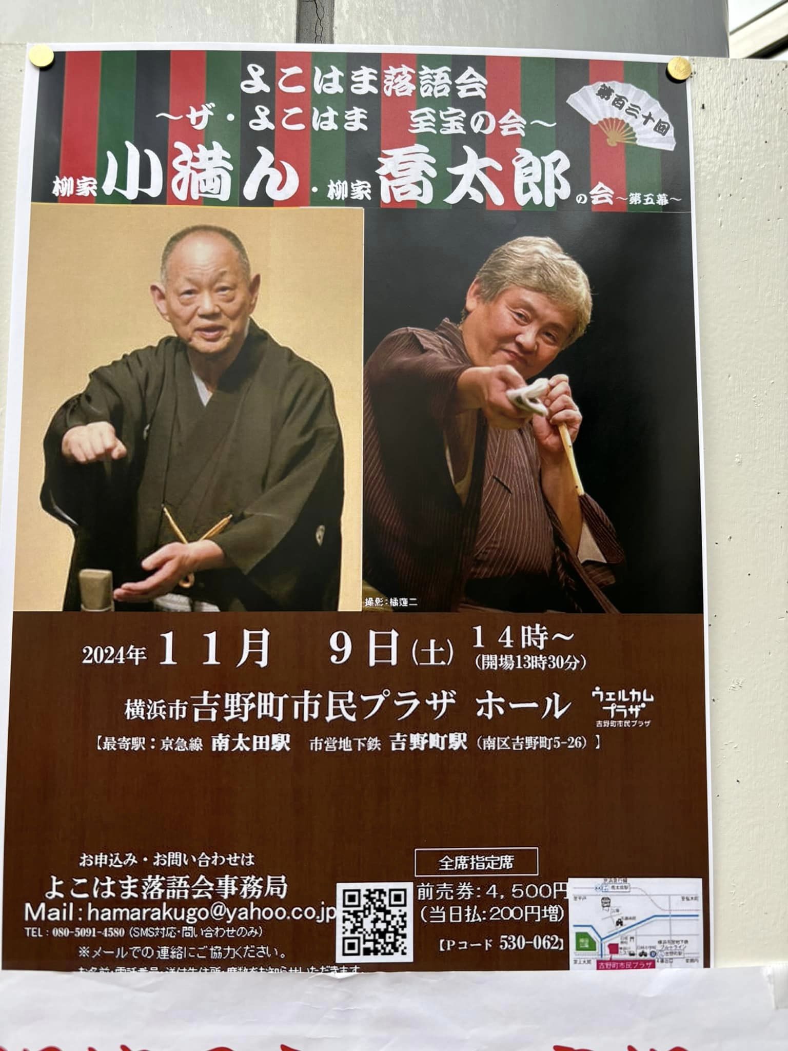 今日もダブルヘッダー。ダブルヘッダー第一試合は小満ん師匠と喬太郎さんの落語会!喬太郎さんは2024/11/9(土)よこはま落語会 柳家小満ん・柳家喬太郎 の会わたし/商売根問喬太郎/強情灸小満ん/時そば~仲入り~小満ん/つるつる喬太郎/名人長二~仏壇叩き~