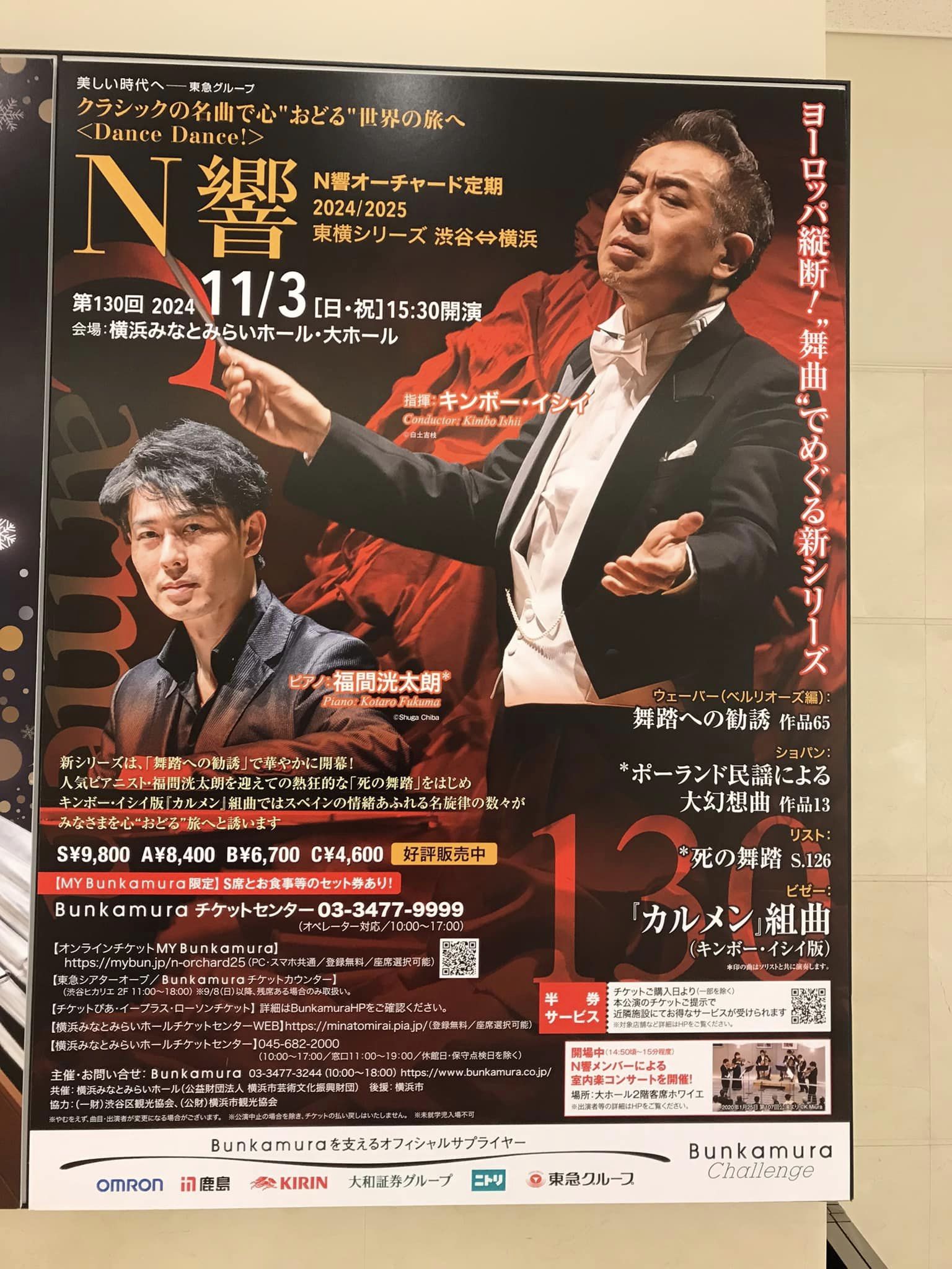 今日もダブルヘッダー。 第一試合は福間さんのピアノ🎹とN響の共演を聴きに横浜みなとみらいホールに参上!カーテンコールのお時間は撮影OKなので、約30枚くらい撮影。 2024年11月3日(日・祝)N響オーチャード定期 2024/2025 東横シリーズ 渋谷⇔横浜<Dance Dance!>第130回15:30開演(14:30開場)大ホール出演キンボー・イシイ(指揮)、福間洸太朗(ピアノ)、NHK交響楽団(オーケストラ)曲目第一部ウェーバー(ベルリオーズ編曲):舞踏への勧誘 Op.65ショパン:ポーランド民謡による大幻想曲 Op.13リスト:死の舞踏 S.126 ★ソリストアンコールモンポウ:歌と踊り 第9番 第二部ビゼー:《カルメン》組曲(キンボー・イシイ版) ★アンコールビゼー作曲「アルルの女」組曲第2番から「メヌエット』