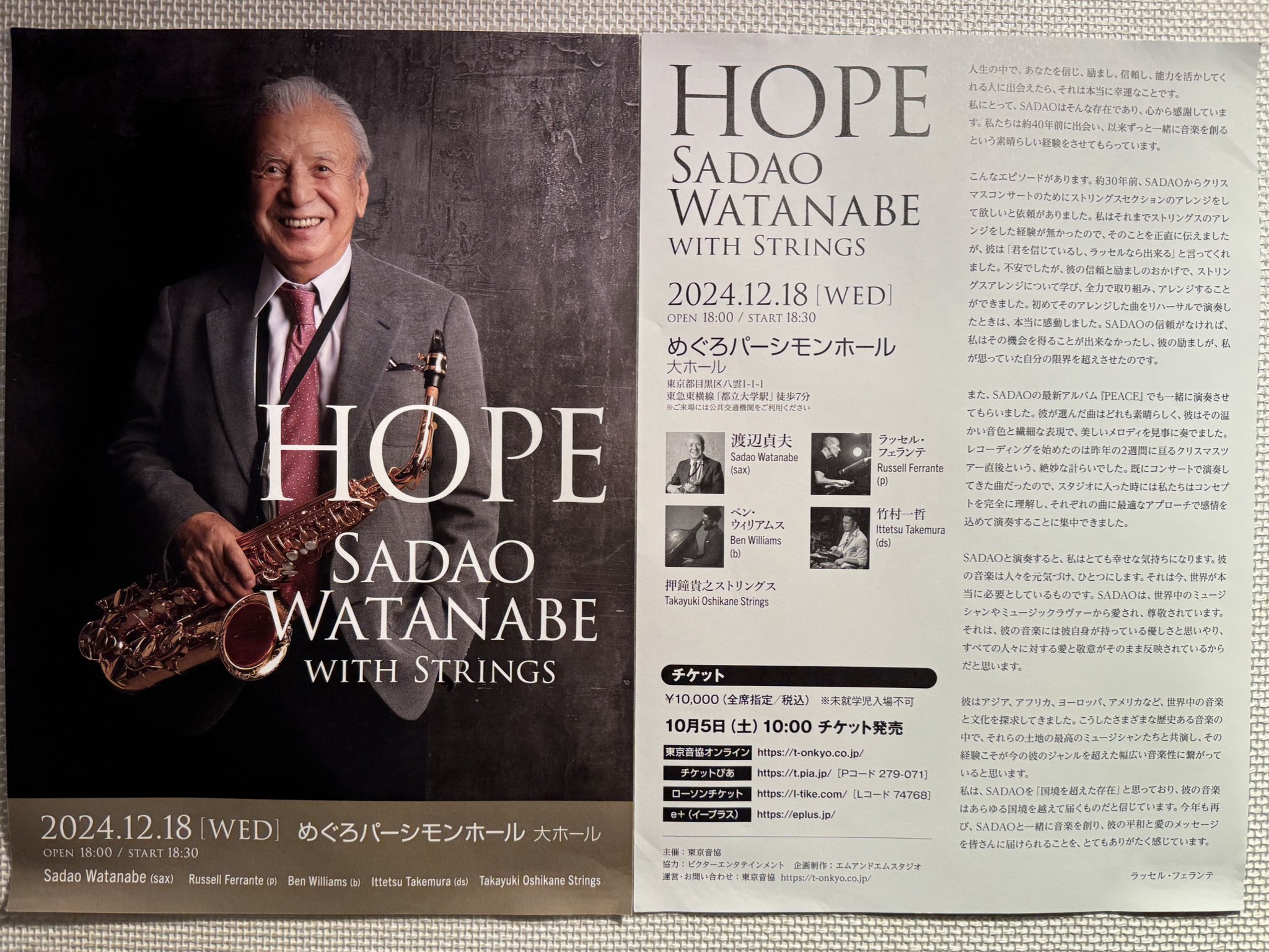 今日はナベサダさんのライブを聴きにめぐろパーシモンホールに参上!ちょっと後ろの席かと思っていたが、Russell Ferranteさん、Ben Williamsさんのの手元が良く観える席。ラッキー!セットリストはラストの2024/12/21 (土) -HOPE- Sadao Watanabe with STRINGS@関内ホールが終わってから追記。2024/12/18 (水) -HOPE- Sadao Watanabe with STRINGS@めぐろパーシモンホール (東京都)渡辺貞夫(as, tamb)Russell Ferrante(p), Ben Williams(b), 竹村一哲(ds)押鐘貴之ストリングス1st Vn: 押鐘貴之、杉山由紀、沖祥子、田島朗子、南條由起、奈須田弦2nd Vn: 桐山なぎさ、渡辺一雄、村井俊朗、岩戸有紀子、藤家泉子、森田千聖Va: 城戸喜代、増田直子、梶谷裕子、渡邉智生Vc: 笠原あやの、遠藤益民、結城貴弘、森谷佳奈第1部: Sadao Watanabe QUARTET1.PEACE2.BUTTERFLY3.ONE FOR JOJO4.I CONCENTRATE ON YOU5.TREE TOPS6.ONLY IN MY MIND - Patti Austinのために書いたバラード。19837.LOPIN'8.I'M A FOOL TO WANT YOU9.TADD'S DELIGHT第2部: Sadao Watanabe with STRINGS10.EASY TO LOVE - Cole Porter11JUST FRIENDS - John Klenner 12.I FALL IN LOVE TOO EASILY - Russell Ferranteさんのアレンジ13.IN THE WEE SMALL HOURS OF THE MORNING14.CYCLING - Russell Ferranteさんのアレンジ。1991年のアルバム「Sweet Deal」より15.SAMBA EM PRELÚDIO - Baden Powell16.MANHATTAN PAULISTA - ナベサダさんtamb17.SONHO DE NATAL (Christmas Dream) - TokyoFMのために作ったクリスマスソングEnc18.HARAMBEE - Sadao Watanabe QUARTET