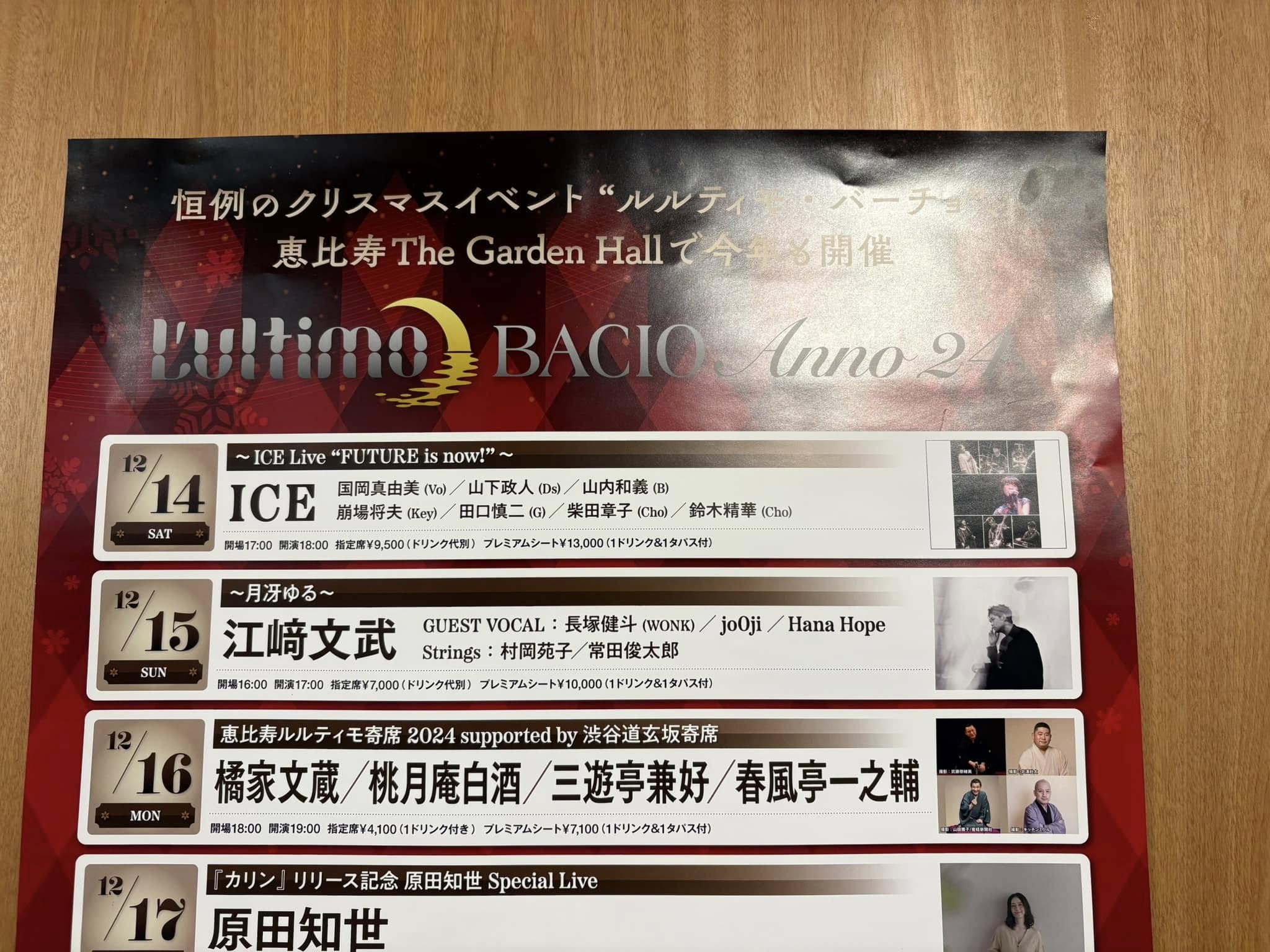 今日は佐藤竹善さんのYour Christmas Night 2024を聴きにBillboard Live YOKOHAMAに参上!2024.12.17.tue. 佐藤竹善 Your Christmas Night 2024@Billboard Live YOKOHAMA佐藤竹善(Vo)青柳 誠(Pf)井上陽介(Ba)江藤良人(Dr)1st2nd