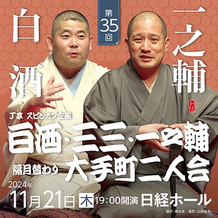 2024年11月21日(木)@日経ホール J亭スピンオフ企画 35 白酒・一之輔 大手町二人会②「壺算」けい木「館林」一之輔「今戸の狐」白酒〜「短命」白酒「薮入り」一之輔
