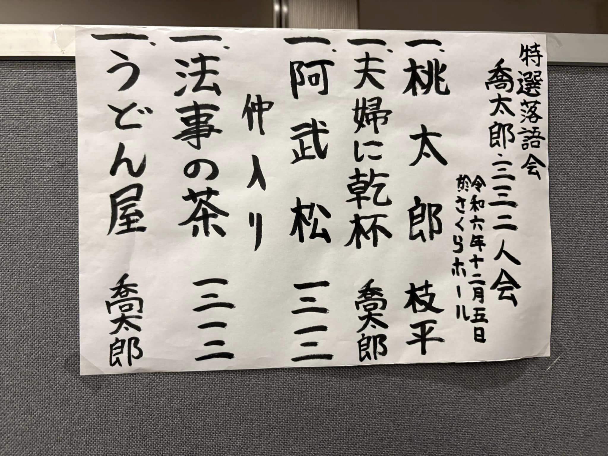 珍しく奥さんと喬太郎さんと三三さんの二人会に参戦。11月の二人会@調布グリ―ンホールは長い噺、喬太郎さん「抜け雀」、三三さん「明烏」の1席ずつ。今日は2席ずつと定常運転。落語の後は、『SEVENTEEN [RIGHT HERE] WORLD TOUR IN JAPAN』@東京ドームに参戦して来た娘さんも合流して、渋谷の「もつ鍋屋さん」で夕飯をいただく。喬太郎さんの落語は、おそらく、2024/11/9(土)よこはま落語会 柳家小満ん・柳家喬太郎 の会以来、約1か月振り。その時は、約2週間入院された後で、お顔がかなりゲッソリされていたが、約1か月でほぼ元通り。笑ファンとしては、ホッとした。三三さんは、「阿武松(おおのまつ)」、「法事の茶」の2席。いずれも「月例 三三独演2024」でネタ下しした、2024年の今年を締めくくるネタ。「阿武松」では、錣山が前相撲の時の小緑というしこ名を小車に付けてくれたクダリで、三三さんの師匠、小三治師匠が自分の前座での名義「柳家小多け」を三三さんに付けた思い出話。小三治師匠の奥さんに「柳家小多けを付けられた弟子はよく廃業する」という「縁起の悪い」話は笑った。小三治師匠はよく弟子を破門されるので、「小多け」でなくても「ダメだな」と思われたら、破門されている。三三さんは相撲ファンで、物心ついた時には輪湖時代。貴ノ花、麒麟児、富士桜、蔵間、栃赤城が活躍した頃。少し後に、若嶋津。若嶋津にだけ強かった、出羽の花義貴の話題も出た。家で調べたら、若嶋津と出羽の花の対戦成績は、15対14で出羽の花が勝ち越し。出羽の花は、貴ノ花、隆の里とも互角の戦い振りで、二子山部屋(初代若乃花時代)の力士には強かった。喬太郎さんのトリネタは「うどん屋」。見事な噺の運び。奥さんも大いに楽しめた筈。2024/12/5(木) 特撰落語会 柳家喬太郎・柳家三三 二人会@渋谷区文化総合センター大和田 さくらホール枝平 桃太郎喬太郎 夫婦に乾杯三三 阿武松〜仲入り〜三三 法事の茶喬太郎 うどん屋