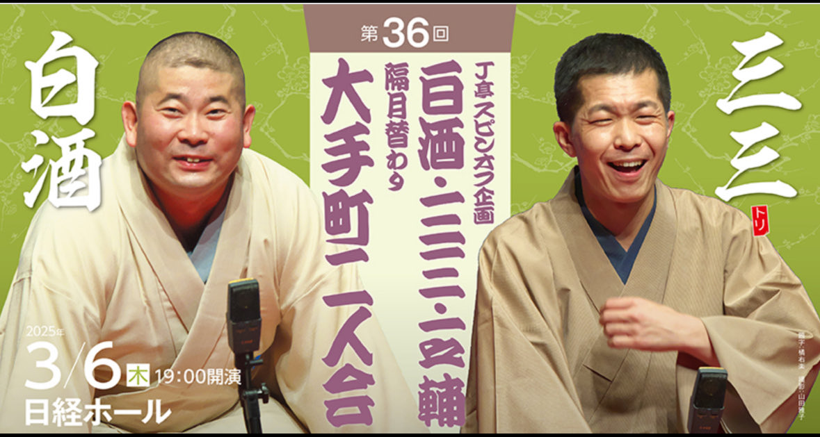 2025/3/6@日経ホール J亭スピンオフ企画36 白酒・三三 大手町二人会 【産経新聞社】「やかんなめ」㐂いち「浮世床」三三「抜け雀」白酒〜「茗荷宿」白酒「崇徳院」三三参考)3/18 シン・道楽亭おでかけ公演三三、柳家三三を上書きする北沢タウンホール『本膳』柳亭市寿『錦の袈裟』柳家三三 遠峰あこ『百年目』柳家三三(ネタ出し)