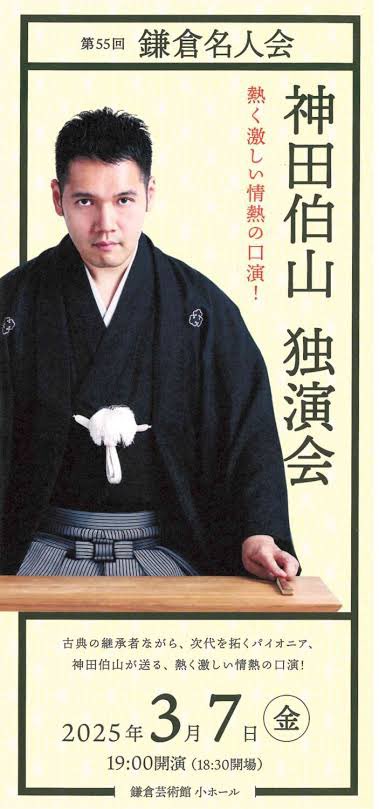今日は神田伯山さんの独演会を聴きに鎌倉芸術館小ホールに参上!中々予約出来ない伯山さんの独演会。先日取手の伯山さんの独演会の争奪戦に参戦したが、予約出来ず。今日はラッキー✌️にも5列目をゲット。一昨日もナベサダさんのライブがここ鎌倉芸術館小ホールで開催されたがSFJAZZ COLLECTIVE@ Blue Note Tokyoと被ったので、泣く泣く断念😢捲土重来。2025年3月7日(金) 19:00 第55回 鎌倉名人会『神田伯山独演会』@鎌倉芸術館小ホール「寛永宮本武蔵伝より狼退治(第四話)」#神田青之丞「貧乏業平」 #神田伯山 「徂徠豆腐」 #神田伯山 ~「無筆の出世」 #神田伯山 参考1)神田伯山さんの「無筆の出世」前回 お聴きしたのは以下の独演会。ダブルヘッダー第2試合は神田伯山さんの独演会@茅ヶ崎市民文化会館。今日はBLUE NOTE TOKYO ALL-STAR JAZZ ORCHESTRA directed by ERIC MIYASHIRO with special guest LARRY CARLTONもあったので、大いに迷ったが伯山さんの独演会の予約は「超困難」で4列目の真ん中の席だったのでBlue Noteは断念。伯山さんは柳家三三さんの落語がお好きなようで、今日も1席目は三三さんの十八番「鹿政談」。三三さんのお噺とは少し話の運びを変えてきた。「無筆の出世」は「ほぼ」ネタ下し。泣ける話。2023年6月23日 (金曜日) 神田伯山独演会@茅ヶ崎市民文化会館一.開口一番 「桃太郎」 桂れん児一.「鹿政談」 神田伯山一.四谷怪談「お岩誕生」伯山仲入り一.「無筆の出世」伯山参考2)第53回「柳家喬太郎 独演会」参考3)2024年11月23日第54回 鎌倉名人会〜柳家三三独演会@鎌倉芸術館一猿/つる三三/二番煎じゲスト⭐️きょうこ/和妻🎶ミネソタの卵売り🥚三三/明烏