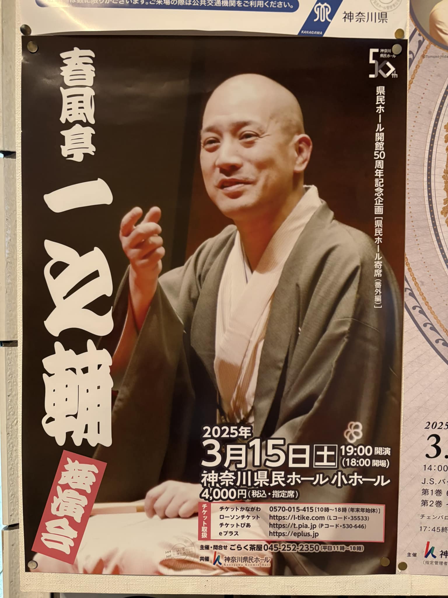 今日は春風亭一之輔さんの独演会を聴きに神奈川県民ホール小ホールに参上!お名残惜しいが、改装前のラストの「県民ホール寄席」。1席目「粗忽の釘」のマクラで一之輔さんと県民ホール寄席との馴れ初めを紹介。一之輔さんが「県民ホール寄席」への初登場は、平成24年(2012年)5月29日の「第285回 真打昇進記念 春風亭一之輔 独演会」。都内の定席での披露目が5月20日まであって、その後僅か10日で「県民ホール寄席」に出演。以来、一之輔さんの「県民ホール寄席」への出演は10回。「第285回 真打昇進記念 春風亭一之輔 独演会」では「ちょっと心配だから、喬太郎さんゲストに呼んどいた」とお席亭、濵永廣生(はまながひろお)さんの心配り、気遣い。一之輔さん曰く「草野球に大リーグ、大谷を呼んじゃった」との感想だが、既に一之輔さん、大リーグレベルだったのでは?と想像。県民ホールは壊して建て直すか、別の場所に移転して建てるか未だ決まっていないようだ。あさま山荘事件で佐々淳行さんが指揮した如く、鉄球で県民ホールを破壊して解体作業はありそう。「皆さん、解体を阻止するため立て籠もりましょう!」と一之輔さん。「県民ホール寄席」の出演10回とも天気が悪いそうで、いつも今日のように小雨でシトシト降ることが多いらしい。県民ホールの傍の「にぎわい座」にも良いイメージはなく、一番強烈な嫌な想い出は十代目 桂 文治師匠がトリを取った会での出来事。文治師匠のトリの前の膝で檜山うめ吉さんが舞台に上がっても、文治師匠が未だ来ない。文治師匠は遅刻魔で、虫の知らせを感じた先輩の依頼で桜木町駅まで文治師匠をお迎えに行く。先輩の勘が当たって、文治師匠はご自分のステッキで桜木町駅の放置自転車を「邪魔なんだよ」と叫びながら打擲していた。一之輔さん「朝佐久と申します。師匠のお出番の時間なので、「にぎわい座」へお越しください」。文治師匠「つないでおけ」一之輔さん「もう膝の方が出ているので、つなぐのは難しいです」。文治師匠「膝は誰なんだ」一之輔さん「檜山うめ吉さんです」。檜山うめ吉さんは文治師匠の膝の常連で、随分可愛がっていたので、速やかに「にぎわい座」に移動。文治師匠がご自分のステッキで桜木町駅の放置自転車を「邪魔なんだよ」と叫びながら打擲していた姿、様子は凄まじかったので、文治師匠を病院に連れていけば「間違いなく、何らかの病名が付いたはず」。柳家三三さんも十代目 桂 文治師匠の常軌を逸した言動、行動をオモシロ可笑しくマクラでよく語るので、その頃のお弟子さんは対応がキット大変だったはず。「粗忽の釘」、「百年目」共に大熱演。「百年目」の後に、一之輔さんに促されて席亭の濵永廣生さんの音頭で三本締めで大円団。2025/3/15(土) 県民ホール50周年記念企画[県民ホール寄席(番外編)]春風亭一之輔独演会一、狸札 らいち一、粗忽の釘 一之輔~仲入り~一、百年目 一之輔参考)何と檜山うめ吉さんの演芸がNHK FMで聴ける。十代目 桂 文治師匠のお導きか。真打ち競演 アンコール▽柳家わさび 桧山うめ吉 春風亭百栄3月15日(土)午後1:05放送2025年3月22日(土)午後1:55配信終了