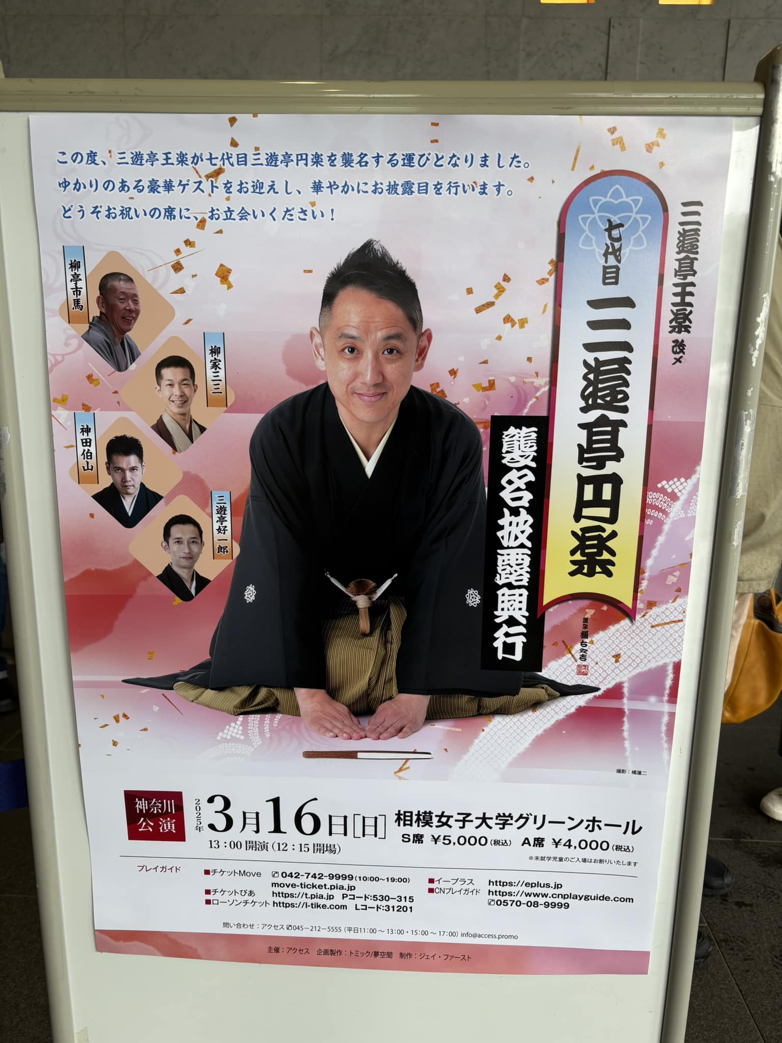 今日は七代目三遊亭圓楽襲名披露興行を聴きに相模女子大学グリーンホールに参上!市馬さん、三三さん、伯山さんが聴ける貴重な会🤗💖💕👍何と言っても、本日のメインイベントは七代目円楽襲名披露の口上。司会の好一郎さんによると六代目の円楽さんの襲名披露興行に司会として帯同したのが、王楽改め七代目円楽。時代の移り変わりは早い。市馬さんのお祝いの口上で相撲甚句。「親子酒」でも市馬さんは美声を披露。三三さんよれば、「親子酒」に歌は不要だが、以前お聴きした市馬さんの「親子酒」にも同じ歌を歌われていたので、良き味。伯山さんのネタは「出世浄瑠璃」。去年、2024年5月18日(土) 神田伯山独演会@町田市民ホールでお聴きした時は尺が25分のロングバージョンだったが、今日は短めの15分バージョン。ロングバージョンの内、屋敷に戻った伊賀守は、すぐさま尾上久蔵と中村大助という二人の家来を探させる。幸いにも二人とも江戸詰めであった。三年前の碓氷峠での出来事を聞きたいと二人は伊賀守の前に呼び付けられ、浄瑠璃の件が知られてしまったかと戸惑った二人だが、なぜか伊賀守は猪を退治したであろうと尋ねてくる。やはり正直に語った方が良かろうと「関の扉を唸った」と言うが伊賀守は「関の扉」である碓氷峠にて猪を退治したのだと勘違い。こうなったら仕方ないと尾上久蔵は、丹波守に襲い掛かろうとした猪を退治したとの虚構の話を講談の調子で滔々と語りはじめる。話を聞いた伊賀守は大喜びをし、二人は百石の加増となったが、一方で困惑する。なぜ浄瑠璃の話が猪退治の話に変わってしまったのか、二人には分からない。丹波守の屋敷を訪ねるとお目通りが叶い、理由を聞いた。丹波守から、この件は時機をみて伊賀守に本当の事を話すので、殿様に対して忠勤に励むよう言い聞かされる。二人は真面目に勤め、伊賀守の立派な家臣となった。三年の後、殿中で丹波守は伊賀守に本当の事を話す。呆れた伊賀守だが、考えてみれば二人とも今では上田の城中で屈指の人物である。立派な家臣が二人出来て二百石くらいは惜しくないと伊賀守も納得した。二人はますます忠勤に励み、尾上と中村の家名は幕末まで長く続いたという。約半分が割愛された。2025/3/16(日) 13:00 開演 七代目円楽襲名披露興行@相模女子大グリーンホール一.けろよん しの字嫌い一.好一郎 つる一.伯山 出世浄瑠璃一.市馬 親子酒~一.口上 市馬 三三 王楽 伯山 好一郎一.三三 旅行日記一.王楽改め七代目円楽 愛宕山
