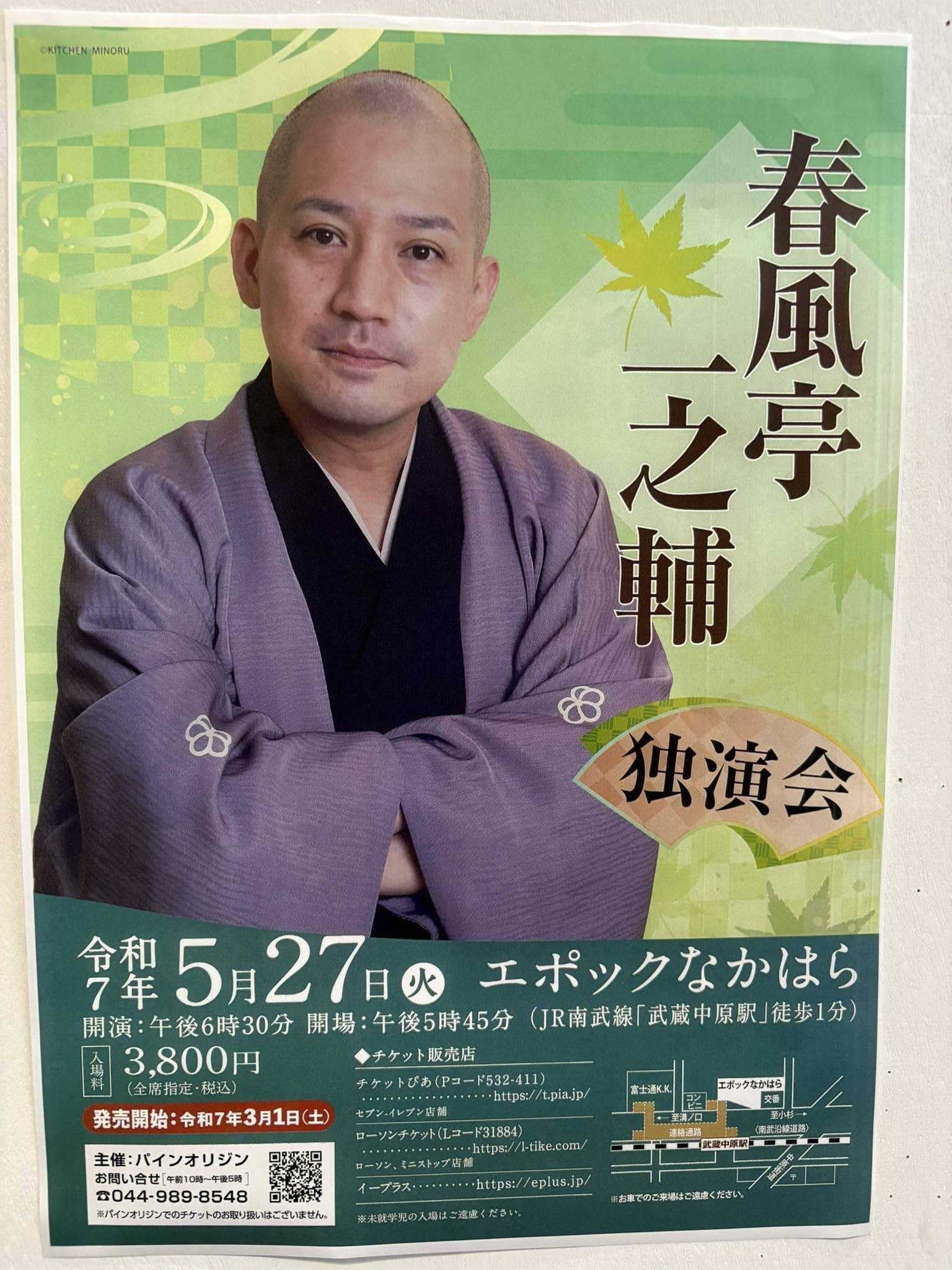 今日は春風亭一之輔さんの独演会を聴きにエポックなかはら(武蔵中原)に参上!2025/5/27(火) 春風亭一之輔独演会@エポックなかはら一.「湯屋番」 いっ休一.「あくび指南」 一之輔~仲入り~一.「らくだ」 一之輔