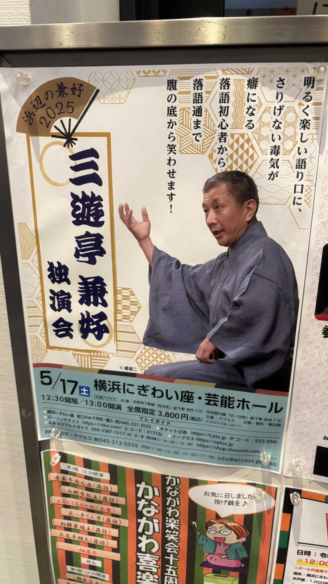 今日から通常モード。先ずは落語とライブのダブルヘッダー。第一試合は三遊亭兼好さんの独演会を聴きに横浜にぎわい座へ参上!5月17日三遊亭兼好独演会〜浜辺の兼好 2025〜@横浜にぎわい座 芸能ホール一.「雛鍔」 兼好一.「元犬」 けろよん一.「風呂敷」 兼好~一.「大山詣り」 兼好