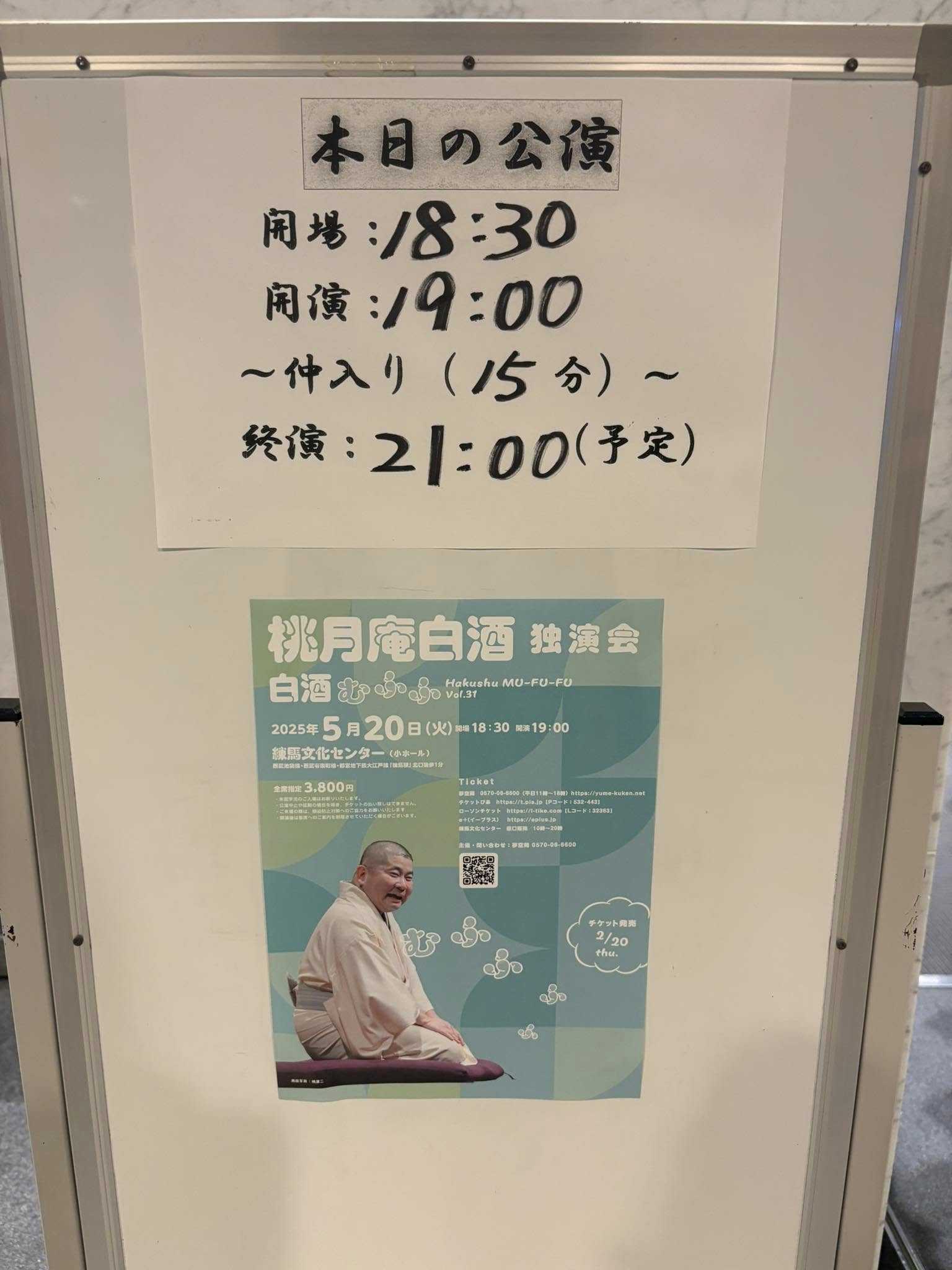 今日は桃月庵白酒さんの独演会を聴きに練馬文化センター小ホールに参上!5月21日 「桃月庵白酒 独演会」🍑白酒むふふ〜Vol.31@練馬文化センター「金明竹」ぼんぼり「佐々木政談」白酒 お仲入り 漫才 ロケット団「寝床」白酒