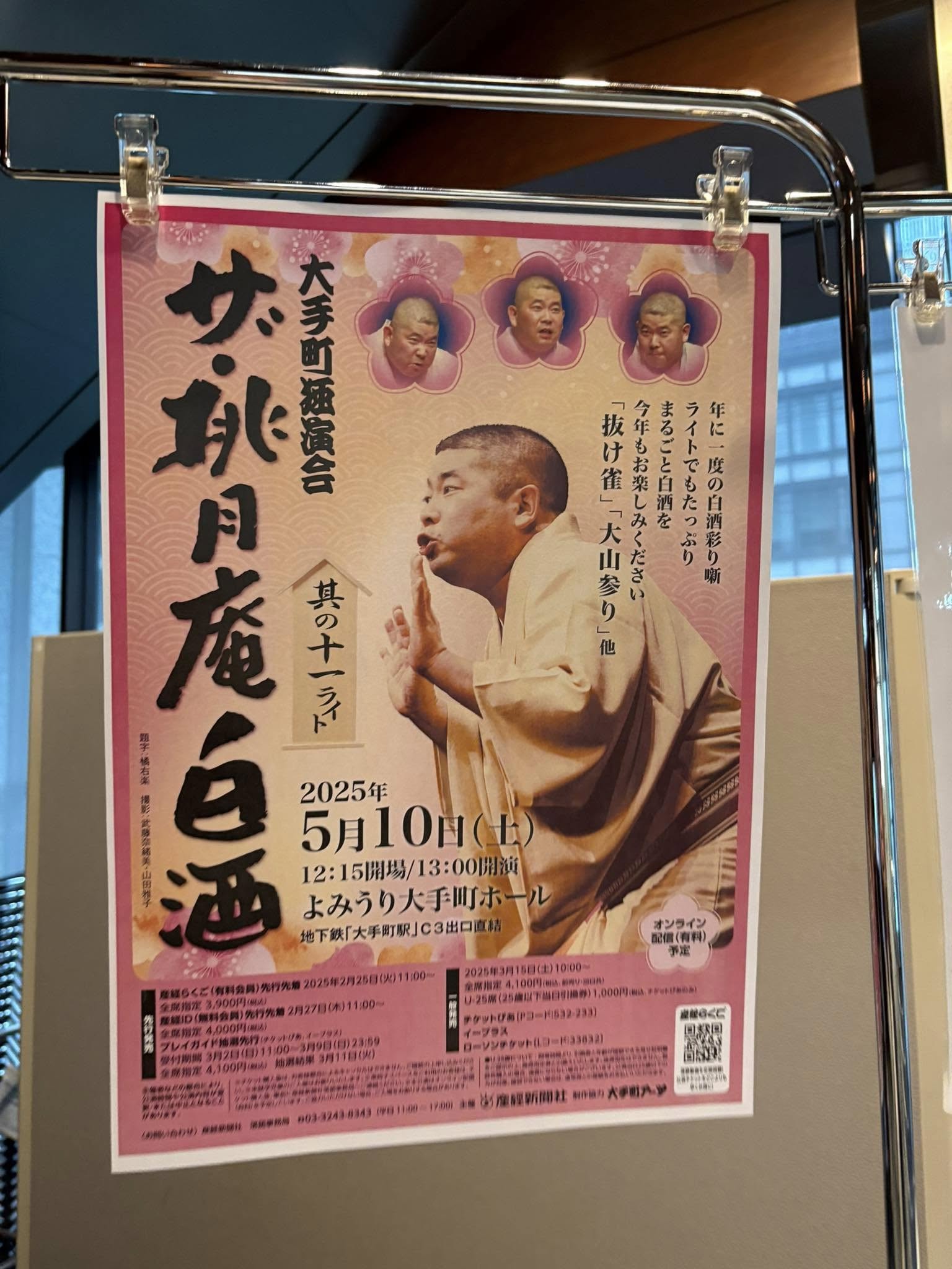 今日はトリプルヘッダー。第一試合は桃月庵白酒さんの独演会を聴きによみうり大手町ホールに参上!2025/5/10@よみうり大手町ホール 大手町独演会 ザ・桃月庵白酒 其の十一ライト「茗荷宿」白酒「大山詣り」白酒〜「花筏」白酒「抜け雀」白酒