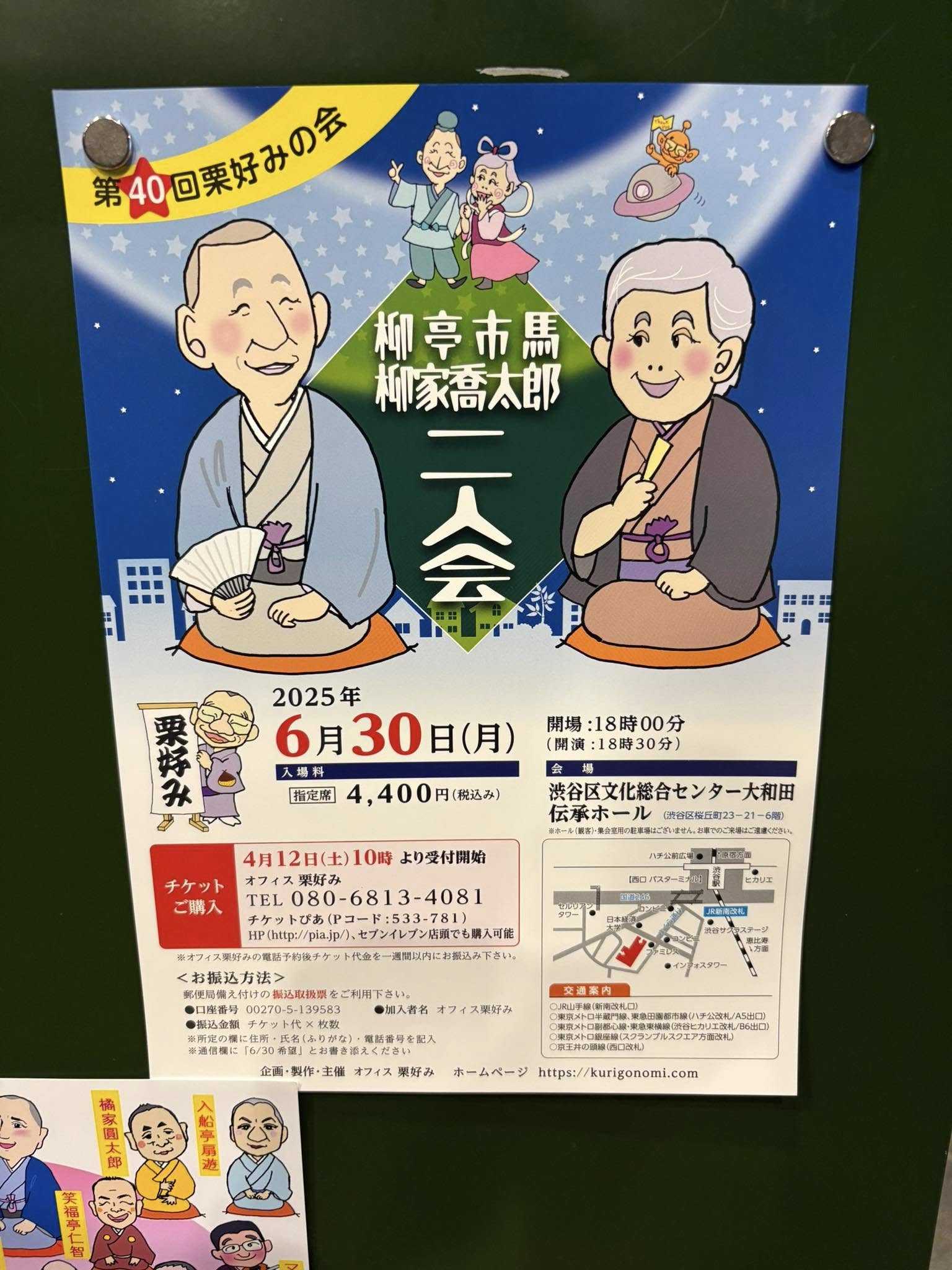 今日は柳亭市馬さんと柳家喬太郎さんの2人会を聴きに渋谷区文化総合センター大和田伝承ホールに参上!2025年6月30日 栗好みの会 市馬・喬太郎 二人会@渋谷区文化総合センター大和田伝承ホール芋俵 市遼雑排 市馬すみれ荘201号 喬太郎仲入り天野屋利兵衛 喬太郎淀五郎 市馬参考)2024年4月22日 栗好みの会 市馬・喬太郎 二人会@日本橋公会堂堀の内 市寿五月幟 市馬夢の酒 喬太郎仲入り夫婦に乾杯 喬太郎大山詣り 市馬