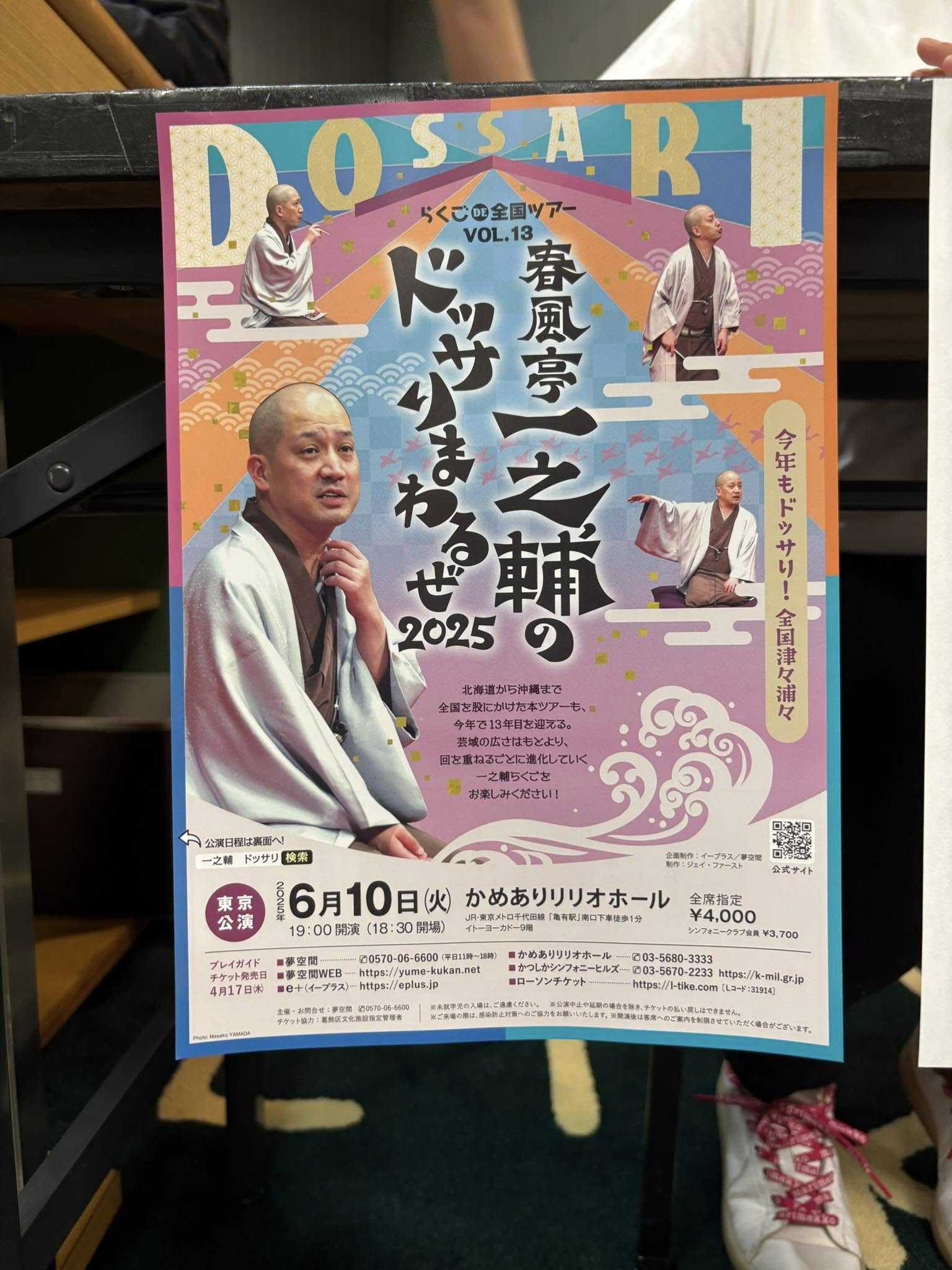 今日は春風亭一之輔さんの独演会を聴きに亀有リリオホールに参上!今日が「春風亭一之輔のドッサりまわるぜ2025」の初日。「春風亭一之輔のドッサりまわるぜ2025」は13年連続の開催。去年は31公演だったらしいが、今年は32公演。東京近郊はもう数回参戦したい。1席目「黄金の大黒」。開口一番で前座がよくやるネタだが、一之輔さん流の味付け。1席目の間に合わなかった方のために言いそびれた「2つの林檎」のクダリを足す。優しい。「黄金の大黒」で寿司のクダリをお聴きしたのは初めて。2席目「三年目」。ネタ下しではないが、一之輔さんの高座では4回目というレアな披露。「ですから、坊主頭で出たら愛想を尽かされると思って、三年の間、髪の毛の伸びるのを待っておりました」というサゲを言いたいがために「三年目」を一之輔さんはセレクト。死後も夫に嫌われまいと気を遣う先妻のいじらしさ。何とも切なく、可愛らしい。ラスト3席目は「意地くらべ 」。落語一之輔春秋で2018年10月26日(金)、2019年10月27日(日)で2回やっているオオネタ。高座でお聴きするのは初めてかと思う。先代の5代目小さん師匠の得意ネタらしいが、当代では一之輔さんだけしかやらないかも。強情者の変な拘りに呆れ、笑うお噺。一之輔さんが編み出した『反対俥』の「かわいい孫のチイちゃん」に近い存在、ご隠居の孫よっちゃんが「意地くらべ 」に登場。ついつい『反対俥』の「かわいい孫のチイちゃん」を思い浮かべて聴いてしまった。2025年6月10日(火) 春風亭一之輔のどっさリまわるぜ2025 らくごDE全国ツアーvol.13 @かめありリリオホール一.オープニングトーク一.元犬 萬都一.黄金の大黒 一之輔一.三年目 一之輔~仲入り~一.意地くらべ 一之輔