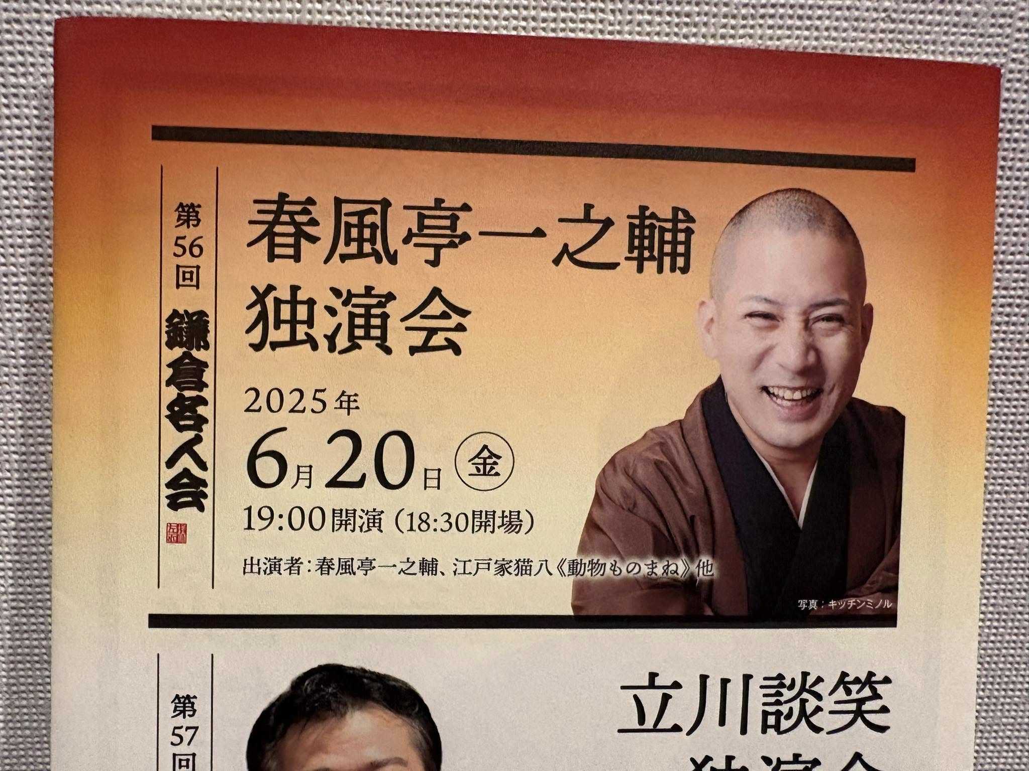 今日は春風亭一之輔さんの独演会を聴きに鎌倉芸術館に参上!「七段目」のマクラが楽しかった。一之輔さんと奥様で映画「国宝」をご覧になって、映画に出演の吉沢亮君と横浜流星君が凄く良いらしい。一方、落語界の「国宝」はいただけない。前座の時に見た、小三治師匠は「ただの汚いお爺ちゃん」。小三治師匠の高座の湯飲み、トリの時に出囃子「二上り羯鼓」が長い間かかっても出て来ない、やっと出て来たのに「すぐに下がってしまう」等々。鎌倉名人会 第56回 春風亭一之輔独演会@鎌倉芸術館 小ホール一.「桃太郎」 らいち一.「七段目」 一之輔~仲入り~一.「動物ものまね」 猫八一.「柳田格之進」 一之輔