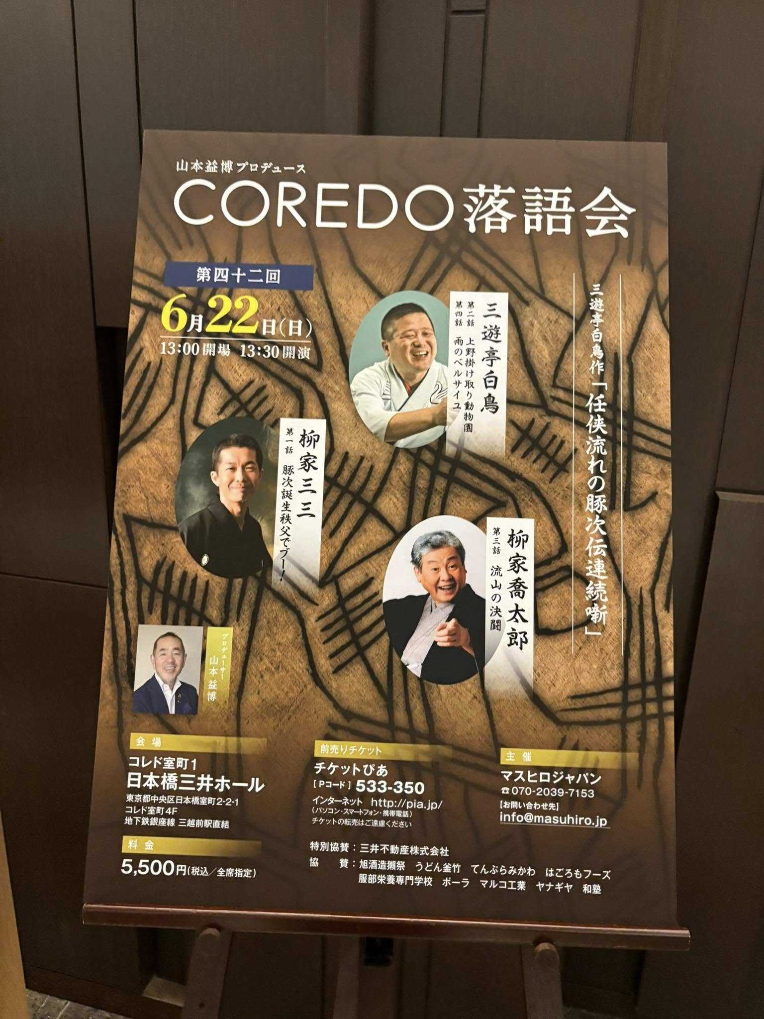 今日はCOREDO落語会を聴きに日本橋三井ホールに参上!白鳥さん、喬太郎さん、三三さんのオープニングトークのみ撮影OKだったので、少々撮影。2025/6/22(日) 第42回「COREDO落語会」豚次任侠伝連続噺@日本橋三井ホール 第一話「豚次誕生秩父でブー!」 <秩父>第二話「上野掛け取り動物園」 <上野>~仲入り~第三話「流山の決闘」 <流山>第四話「雨のベルサイユ」 <掛川>参考1)第1日:三三と豚次の五日間 ~柳家三三 「任侠流れの豚次伝(三遊亭白鳥作)」 通し公演~11月14日(月)19時開演@東京証券会館ホール第一話「豚次誕生秩父でブー!」 <秩父>第二話「上野掛け取り動物園」 <上野>参考2)第2日:三三と豚次の五日間 ~柳家三三 「任侠流れの豚次伝(三遊亭白鳥作)」 通し公演~11月15日(火)19時開演@東京証券会館ホール第三話「流山の決闘」 <流山>第四話「雨のベルサイユ」 <掛川>参考3)第3日:三三と豚次の五日間 ~柳家三三 「任侠流れの豚次伝(三遊亭白鳥作)」 通し公演~11月17日(木)19時開演@東京証券会館ホール第五話「天王寺代官切り」 <大阪>第六話「男旅牛太郎」 <名古屋>参考4)第4日:三三と豚次の五日間 ~柳家三三 「任侠流れの豚次伝(三遊亭白鳥作)」 通し公演~11月18日(金)19時開演@東京証券会館ホール第七話「悲恋かみなり山」 <京都>第八話「チャボ子絶唱」 <名古屋>参考5)第5日:三三と豚次の五日間 ~柳家三三 「任侠流れの豚次伝(三遊亭白鳥作)」 通し公演~11月19日(土)13時開演@東京証券会館ホール第九話「人生鳴門劇場」 <和歌山-鳴門海峡-徳島>第十話「金毘羅ワンニャン獣の花道」 <琴平>