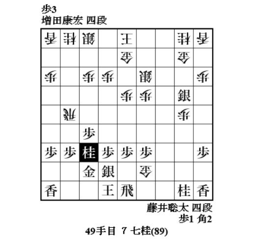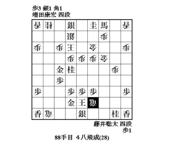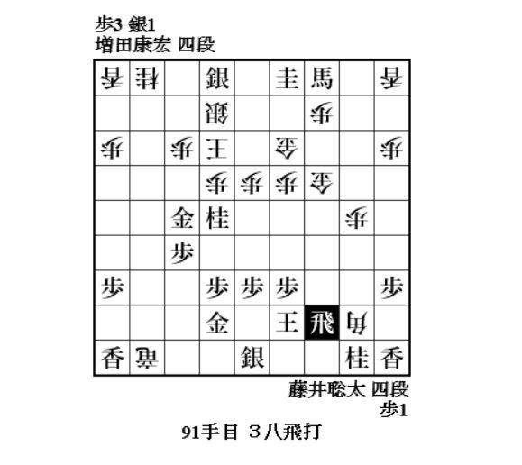トドメの87手目7五金打に止む無く88手目4八飛成と切って90手目2八角打。ここで冷たく91手目3八飛打。攻防ともに見込みなく、増田さんはここで投了。
