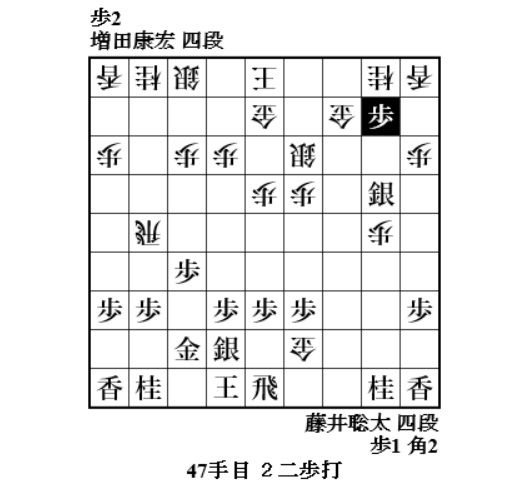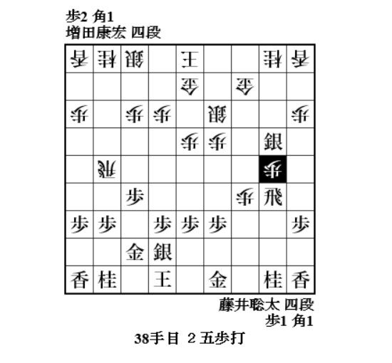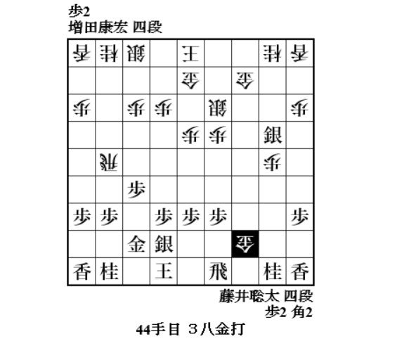 序盤は増田さんの飛車が躍動し、38手目2五歩打でいい感じだったがこの手に変えて3七歩成りも有力だったか。手順に39手目3六飛と歩を補充した上に3筋に飛車を回らせてしまう。余り良い構想では無かったかも。