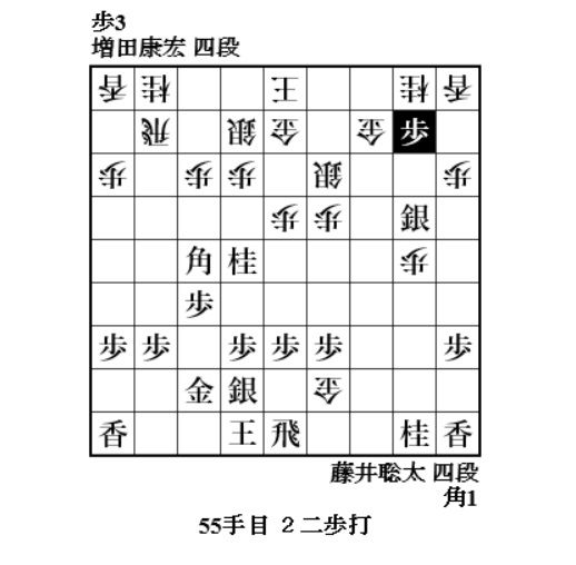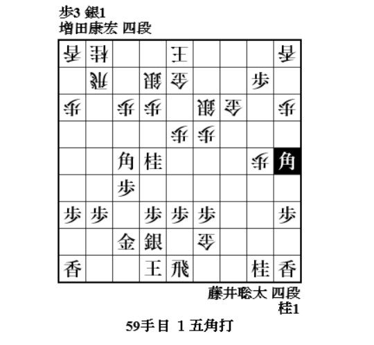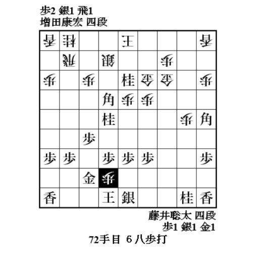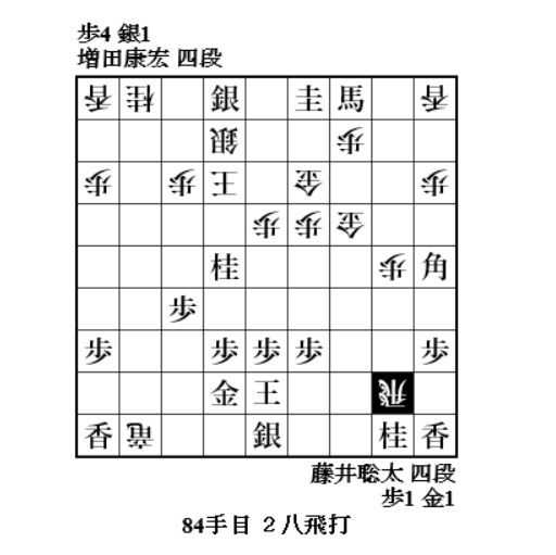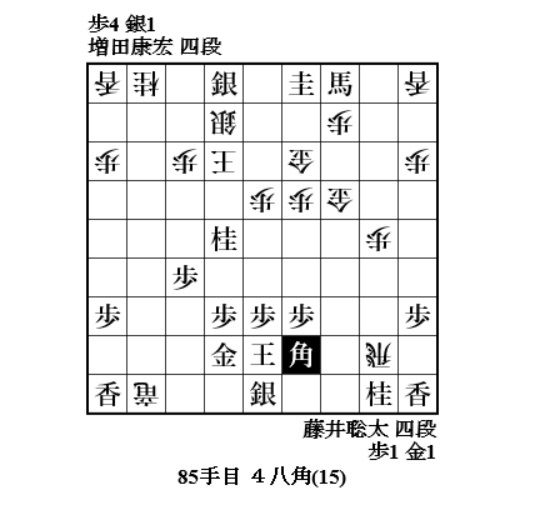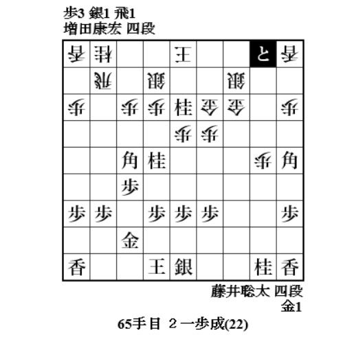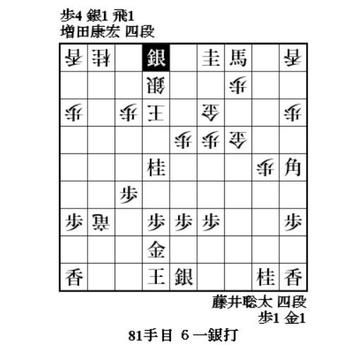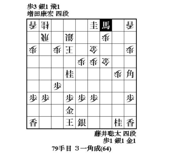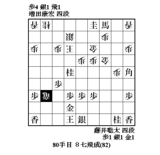 やっと増田さんに手番が回ってきて、72手目6八歩。焦点の歩。どれで取って味が悪い。一番危なそうな同金。8七飛車成でも藤井玉大丈夫ということか。77手目4一桂成、79手目3一角成で増田玉を包み込む。